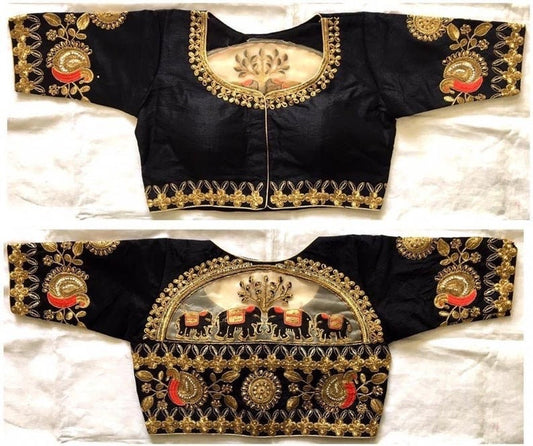 1. This exquisite black embroidered blouse features intricate gold embroidery, adding a touch of elegance...