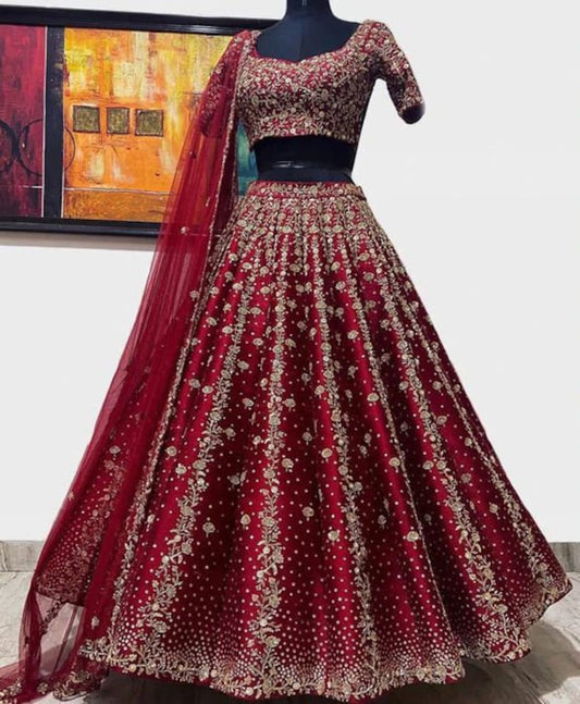 Refresh your look wearing this gorgeous dark maroon colored lehenga choli.The silk lehenga is beautified...