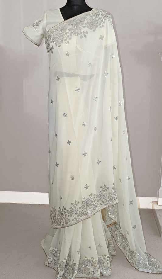 Beautiful cream white soft organza saree with beaded and sequin embroidery and matching blouse