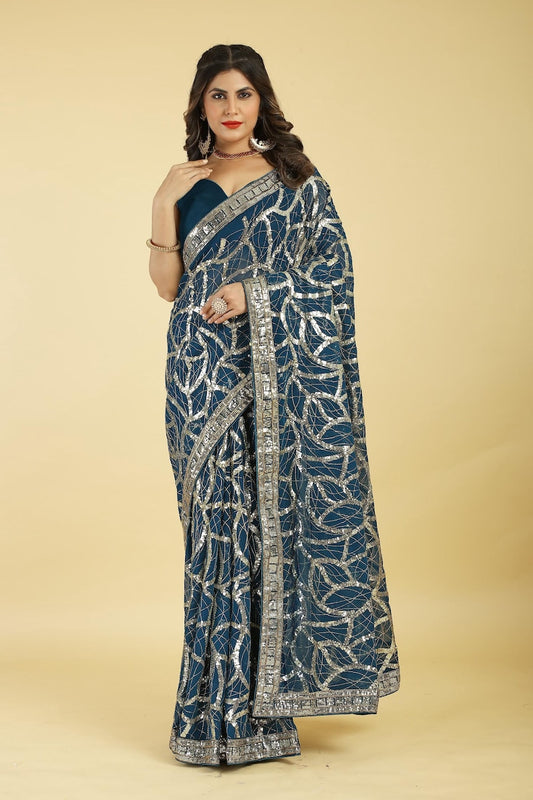 SAREE FABRIC- Printed Faux Georgette With Dual Sequins Embroidered Work With Back PatchSAREE LENGTH- 5.50...