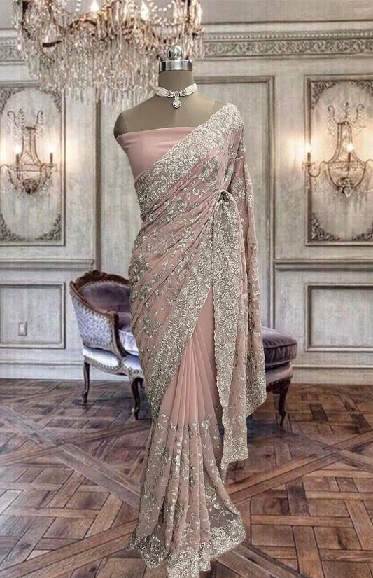 Beautiful peach color net saree with thread and sequin work and continuous blouse piece.