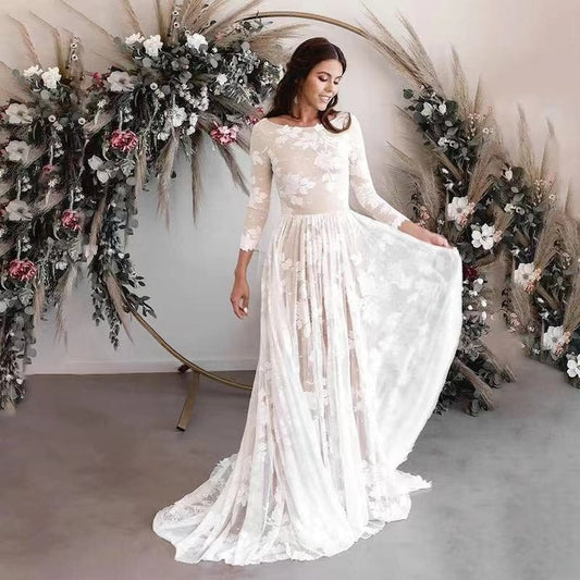 Fabric: Chiffon, Lace Silhouette: Trapeze Length: Asymmetrical Collar shape: Boat neck Straps and sleeves: 1/2 sleeves Back Style: Back Zip Characters: Without...