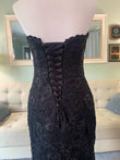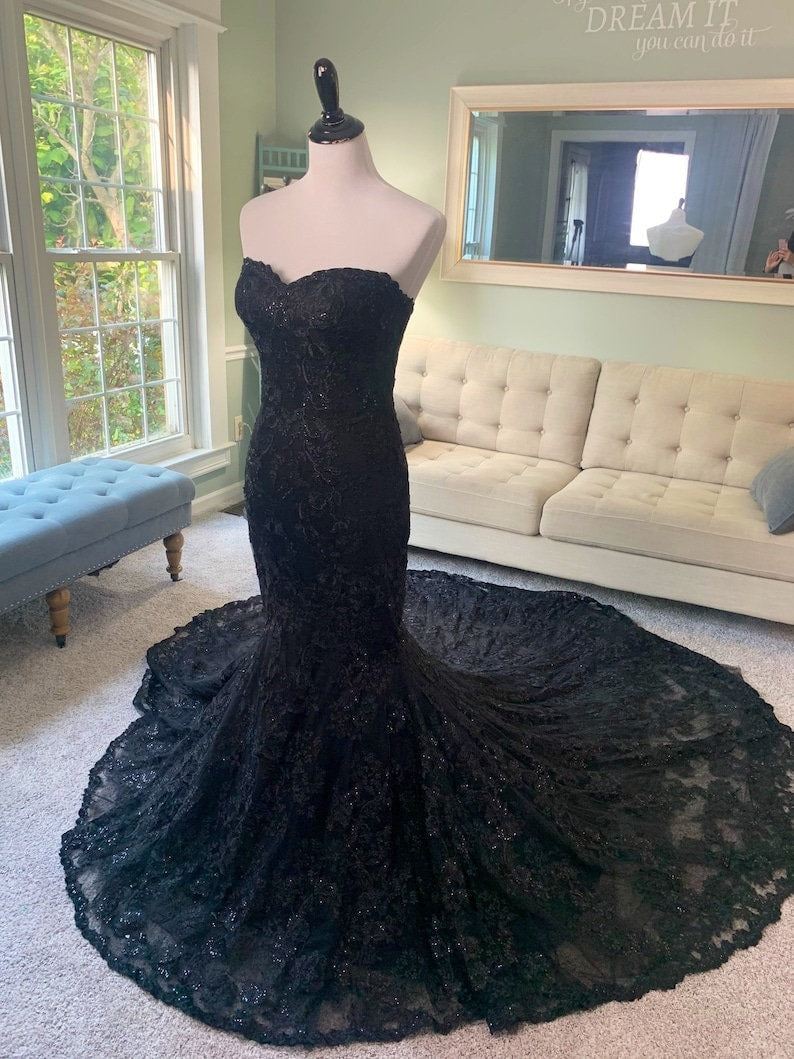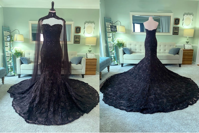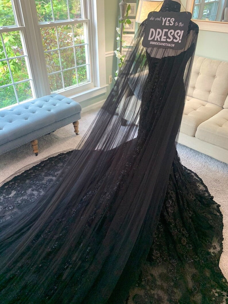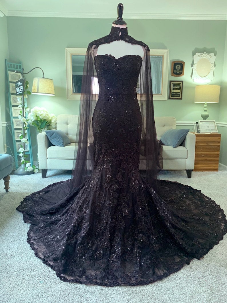 It can be worn as a strapless black dress, with a removable black cape veil or with removable illusion sleeves. It is a total show-stopper!