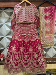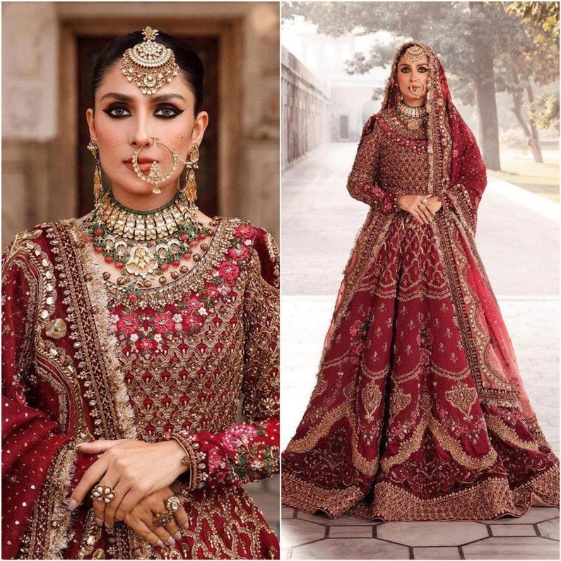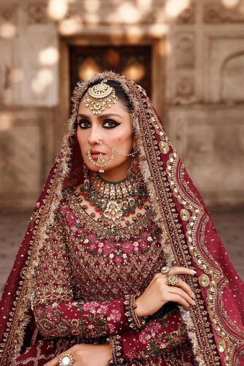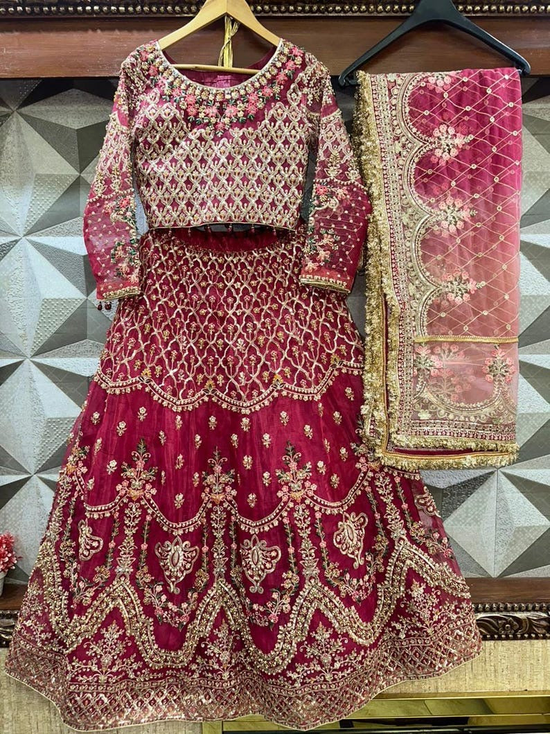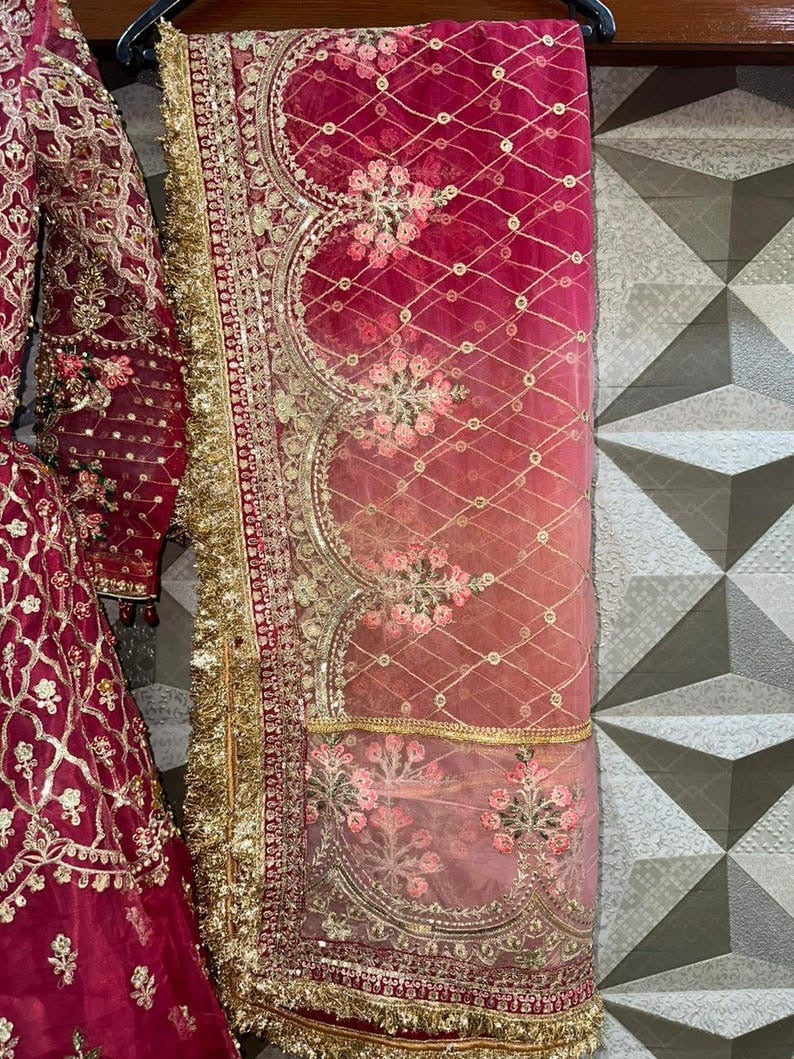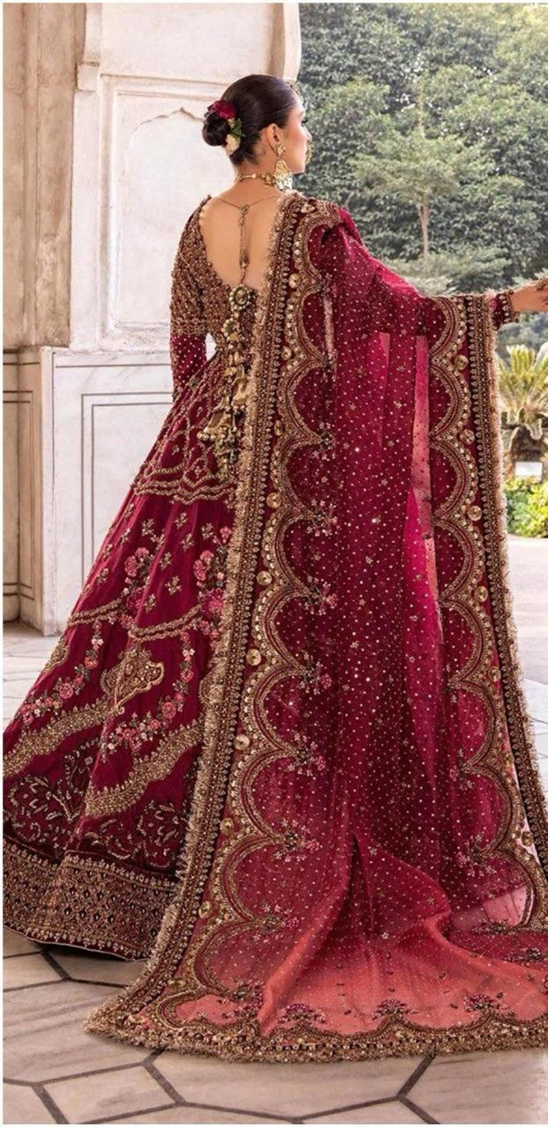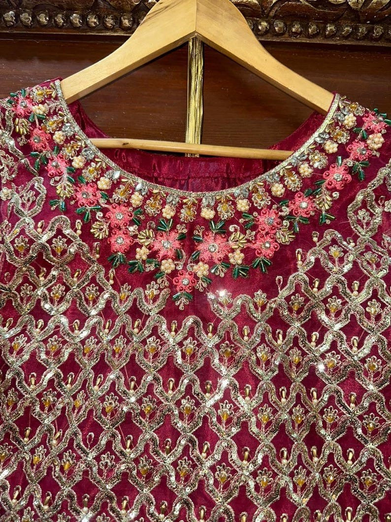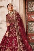 This deep maroon kalidar organza peshwas is intricately embellished with multi-hued golds, silvers and monotone resham threads on an inventive floral setting, and comes with a Korean silk deep maroon bustier. Accentuated with a voluminous Korean silk lehenga handcrafted with an intricately embellished border, an organza dreamy dupatta framed with embellished borders with scalloped edges on all four sides and a sparkling embellishment spread, making this statuesque design luxuriant in every way.