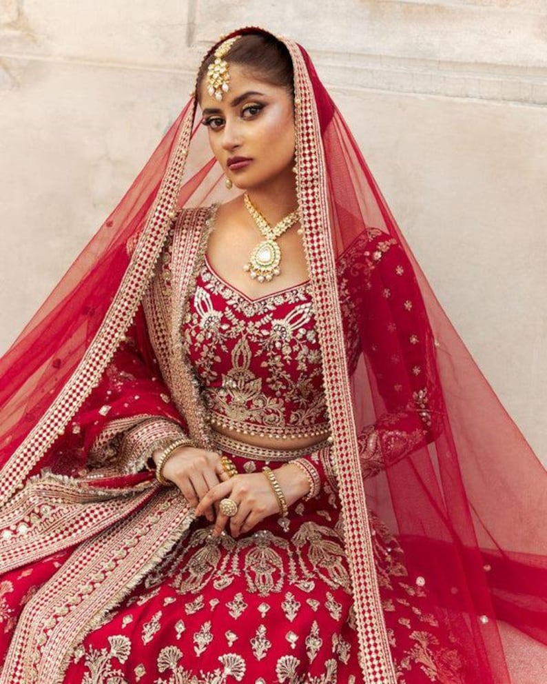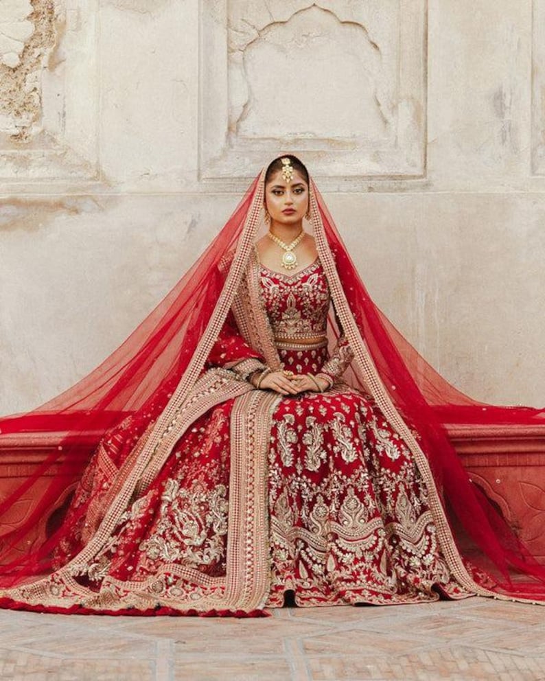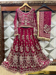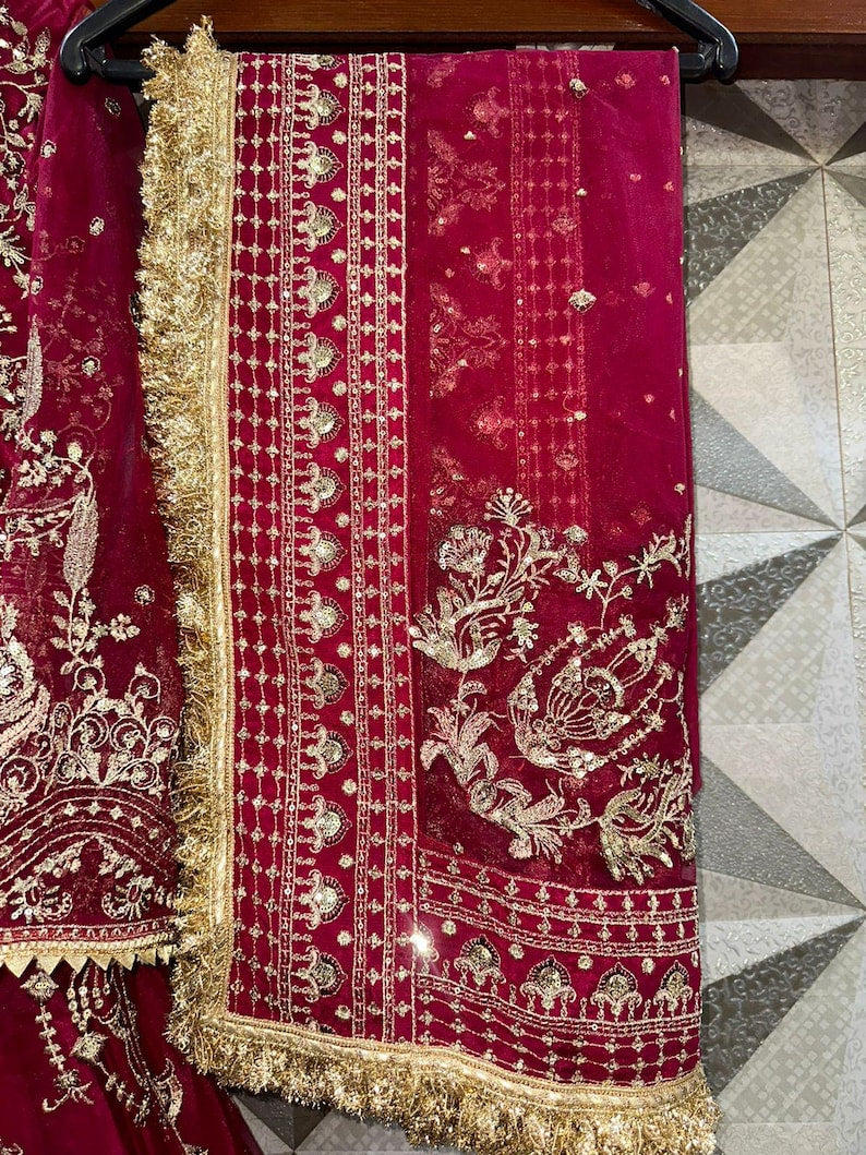 This deep maroon kalidar organza peshwas is intricately embellished with multi-hued golds, silvers and monotone resham threads on an inventive floral setting, and comes with a Korean silk deep maroon bustier. Accentuated with a voluminous Korean silk lehenga handcrafted with an intricately embellished border, an organza dreamy dupatta framed with embellished borders with scalloped edges on all four sides and a sparkling embellishment spread, making this statuesque design luxuriant in every way.