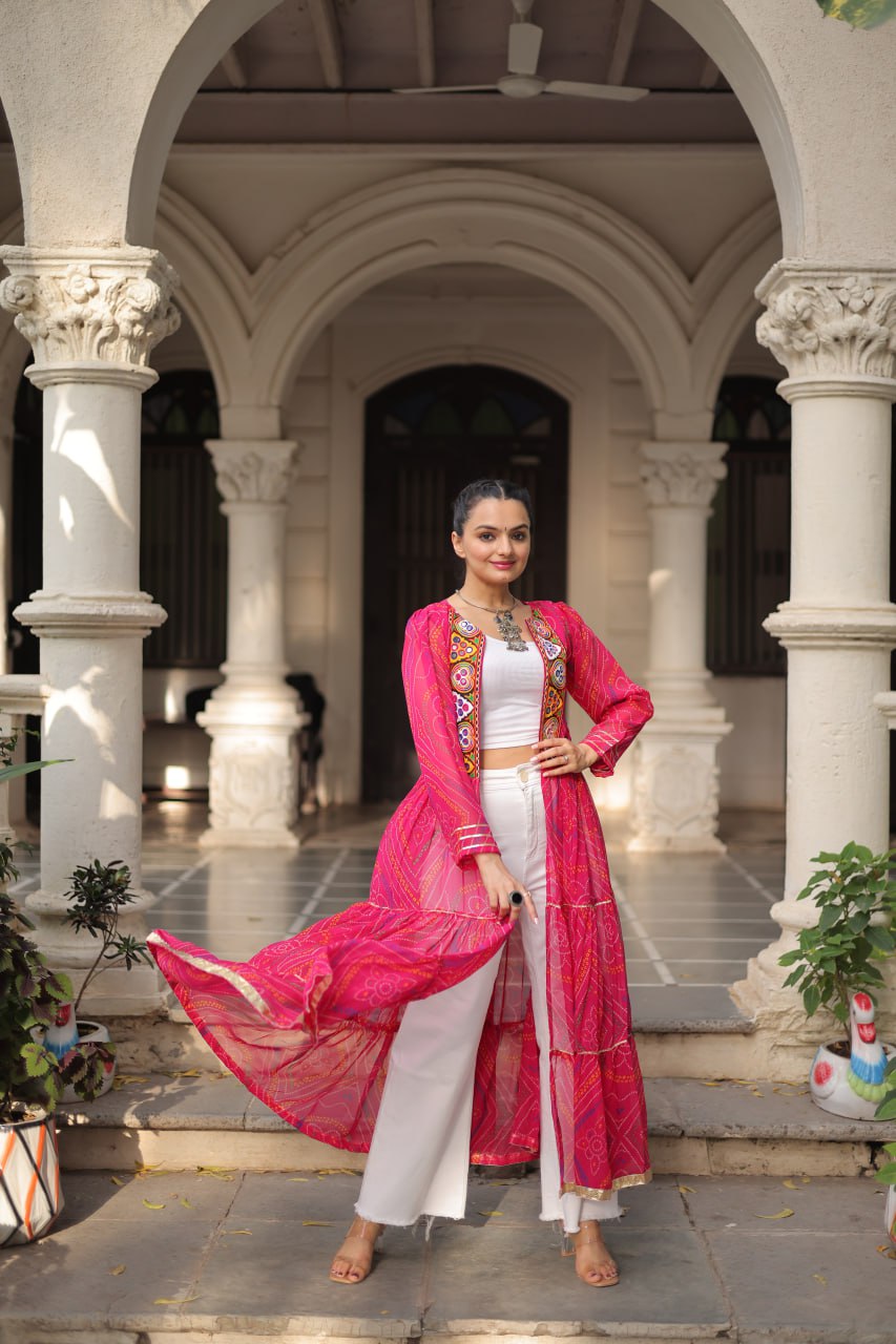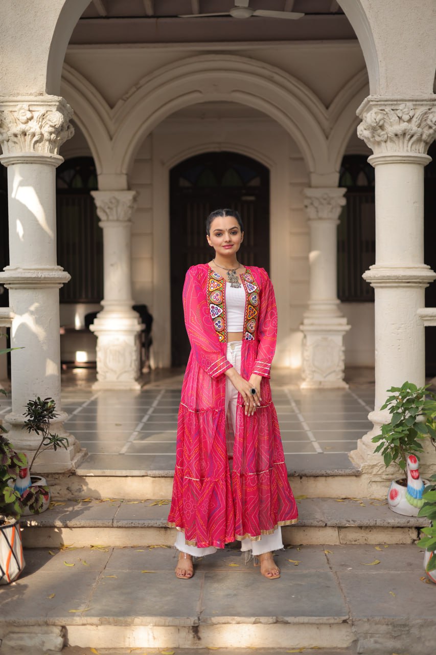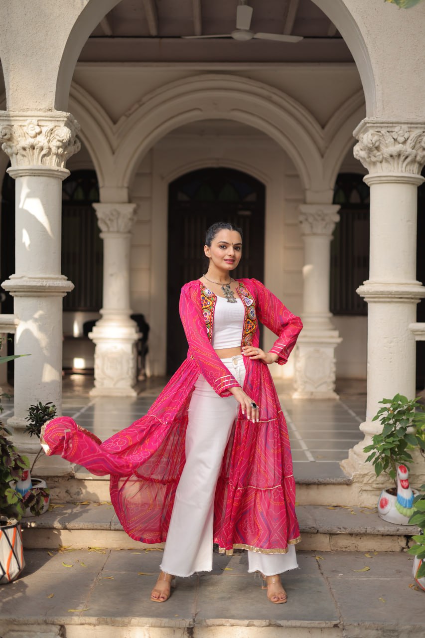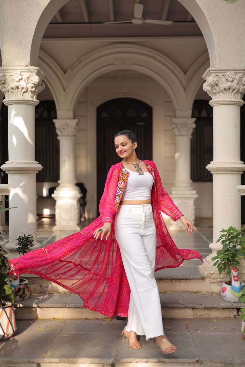 Bandhani Print work with kutchi patchwork in Faux Georgette Kurti