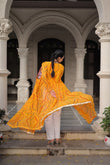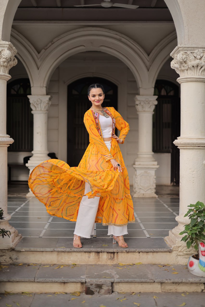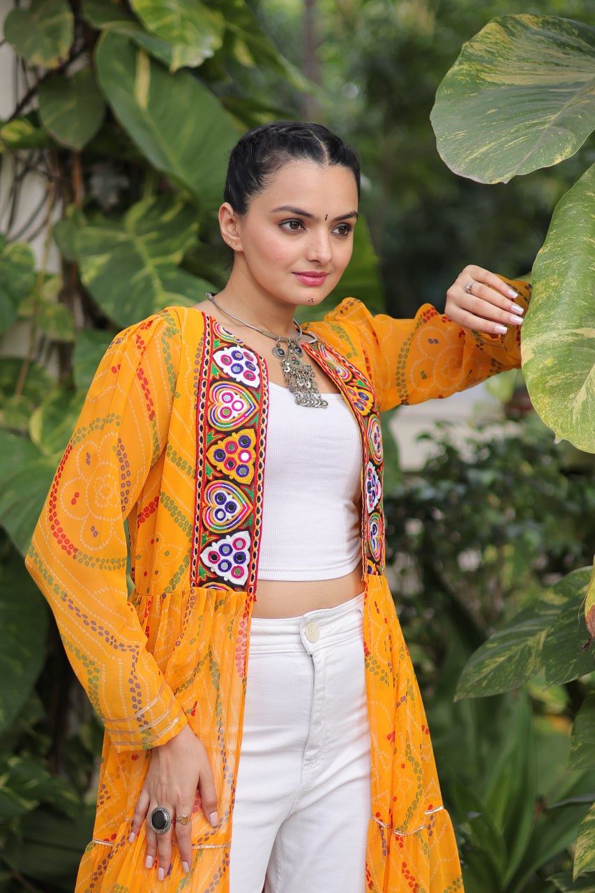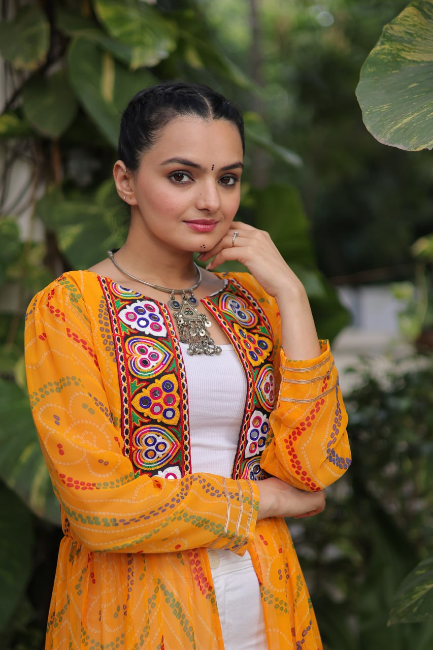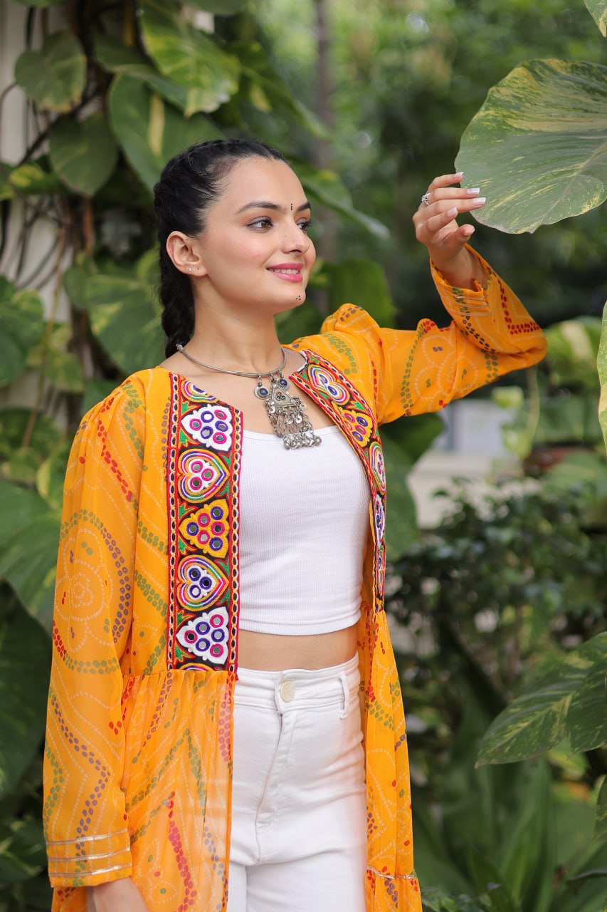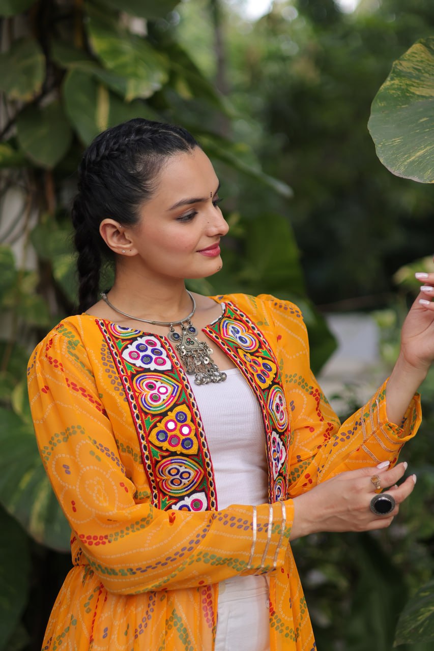 Bandhani Print work with kutchi patchwork in Faux Georgette Kurti
