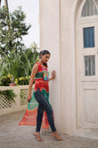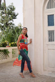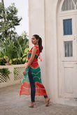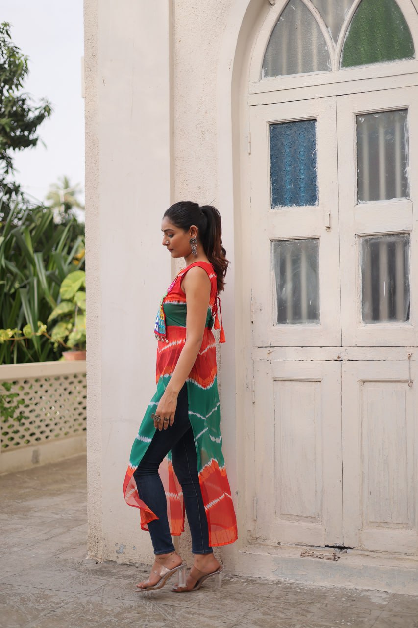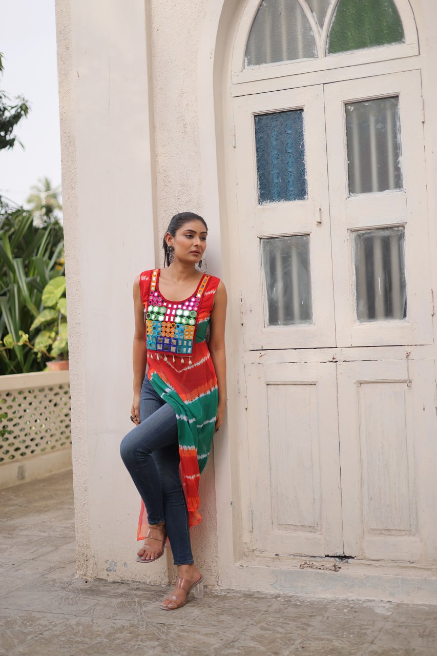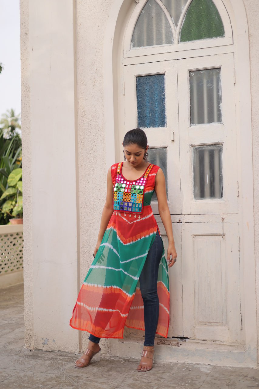 Bandhej Printed Georgette With Kutchi Gamthi Mirror & Codi lace work Green kurti
