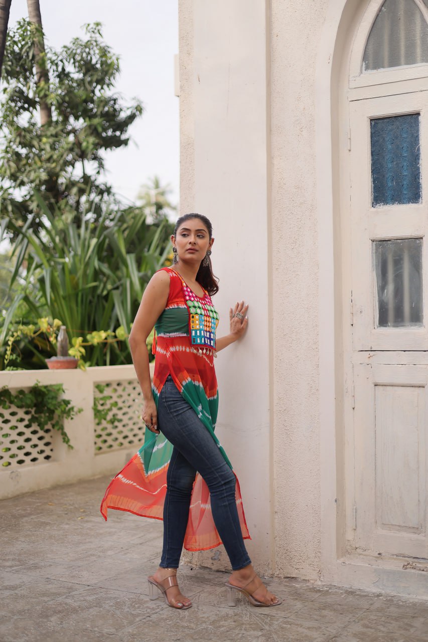 👉🏻 Fabrics & Work :- Bandhej Printed Georgette With Kutchi Gamthi Mirror & Codi lace work