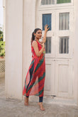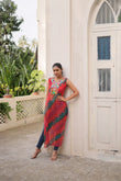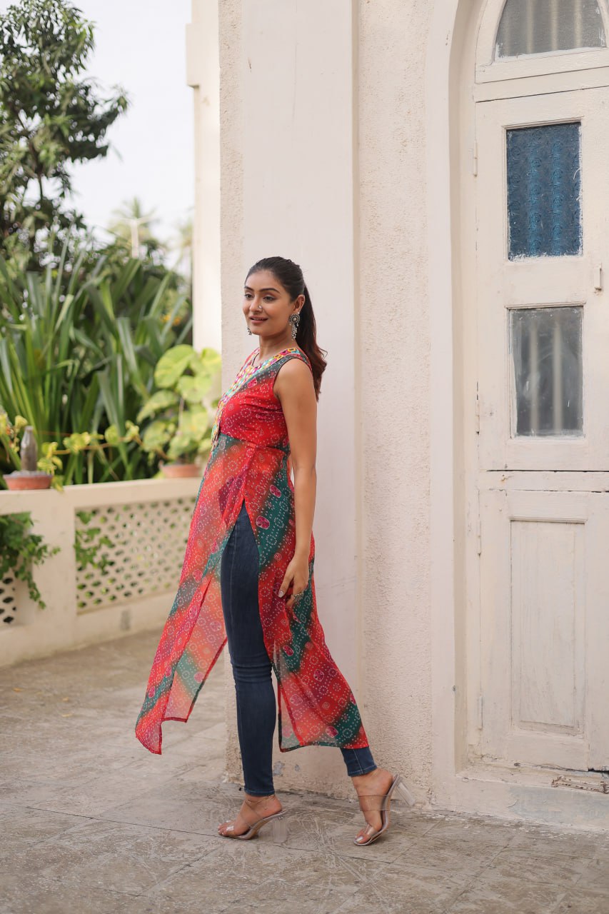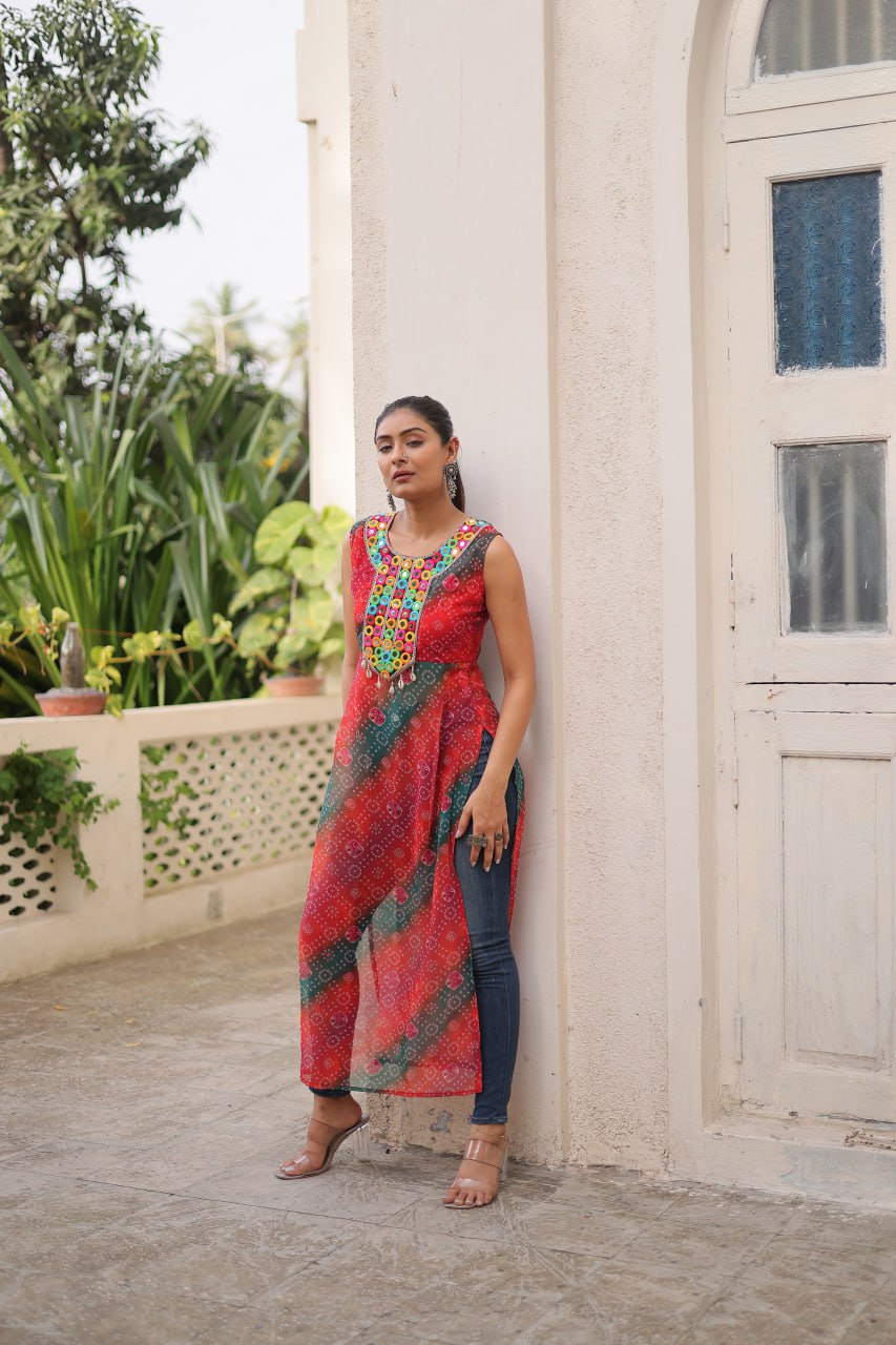 Bandhej Printed Georgette With Kutchi Gamthi Mirror & Codi lace work Red kurti