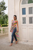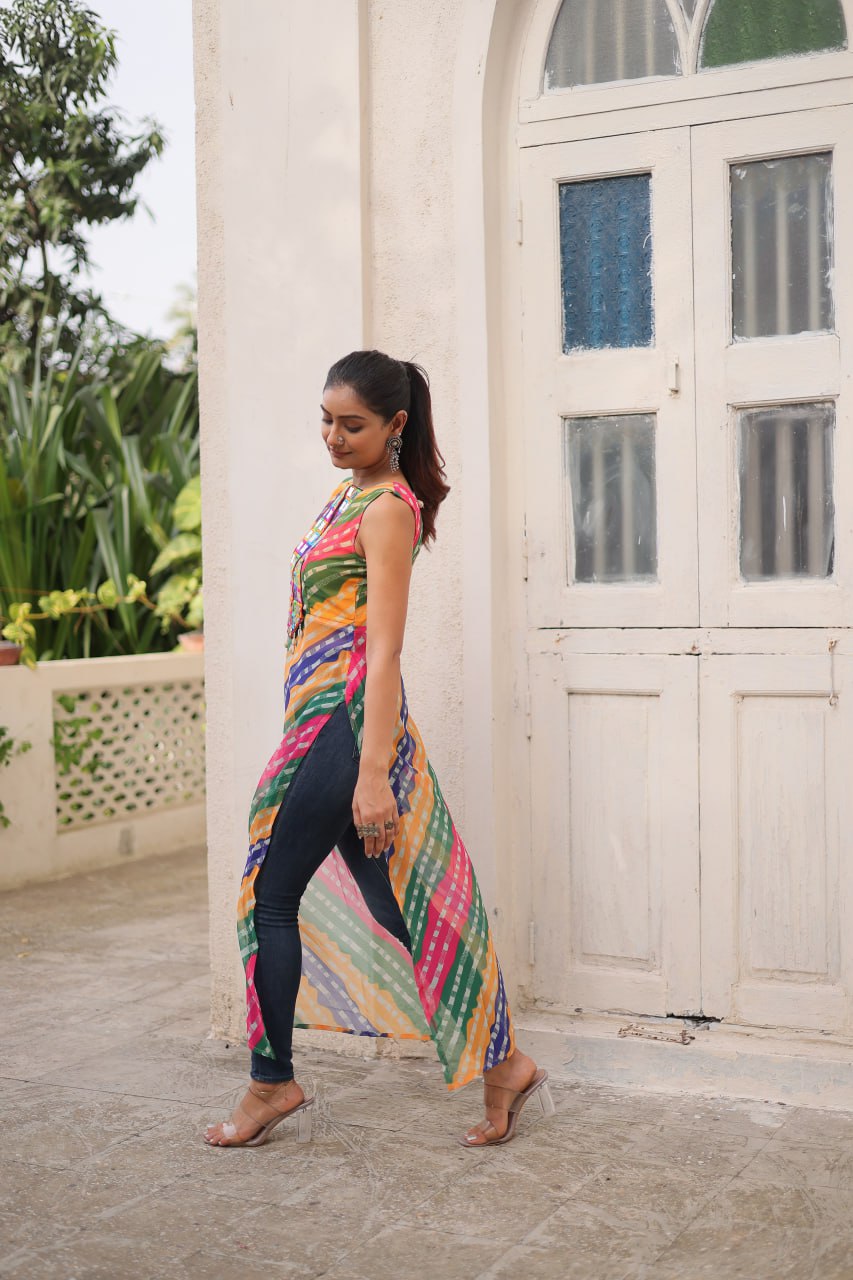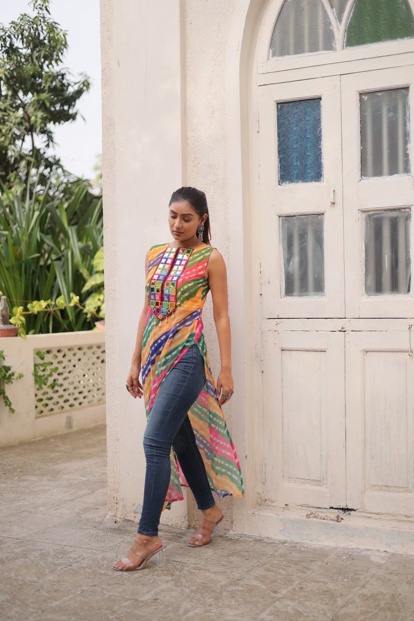 Bandhej Printed Georgette With Kutchi Gamthi Mirror & Codi lace work Yellow kurti
