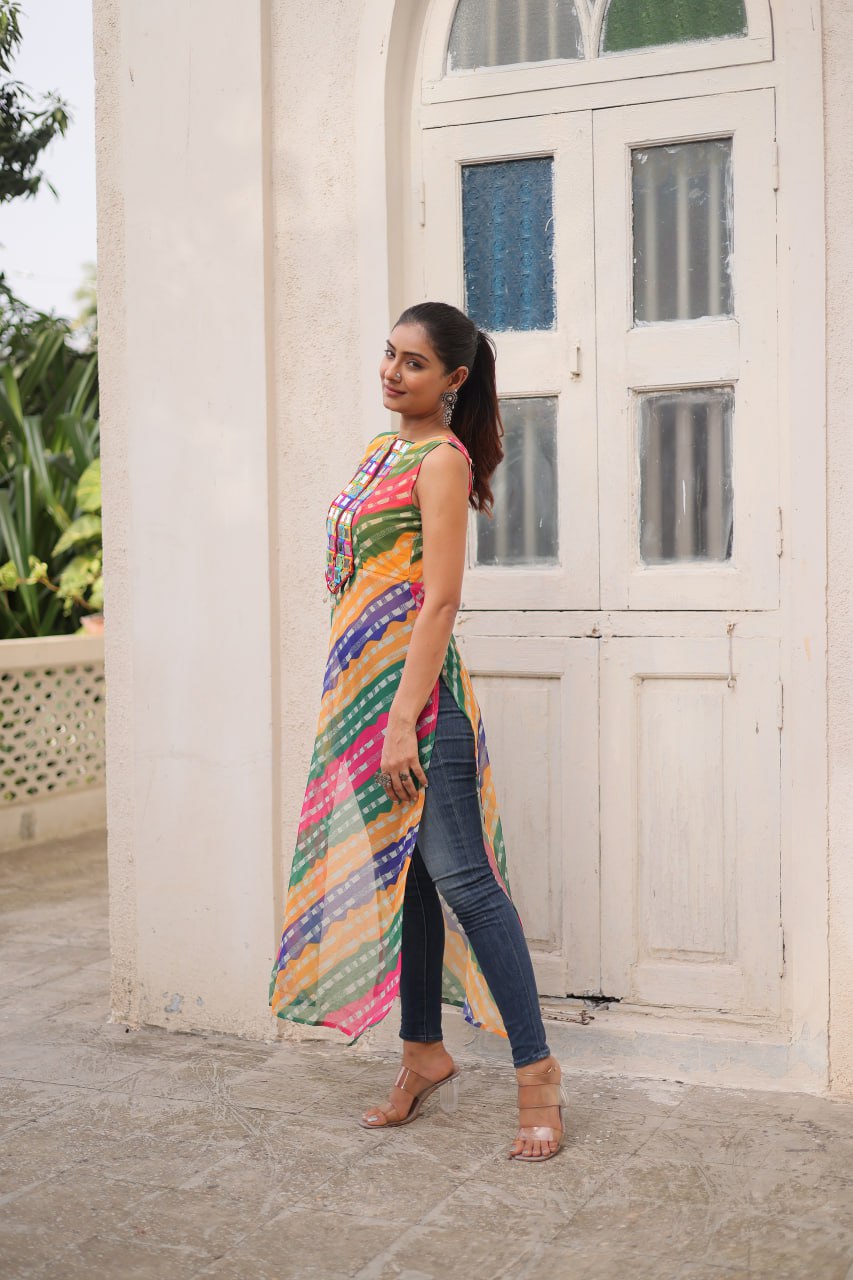 👉🏻 Fabrics & Work :- Bandhej Printed Georgette With Kutchi Gamthi Mirror & Codi lace work