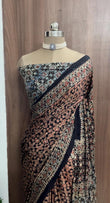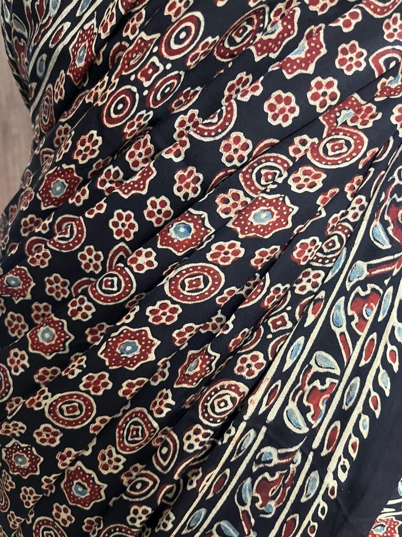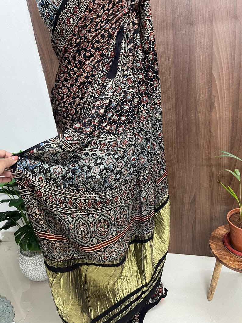 Beautiful black Ajrakh hand block printed pure modal silk saree