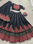 Beautiful Black Foil Work Silk Navaratri Wear Lehenga Choli With Dupatta