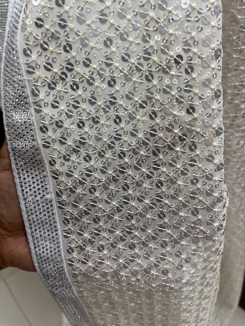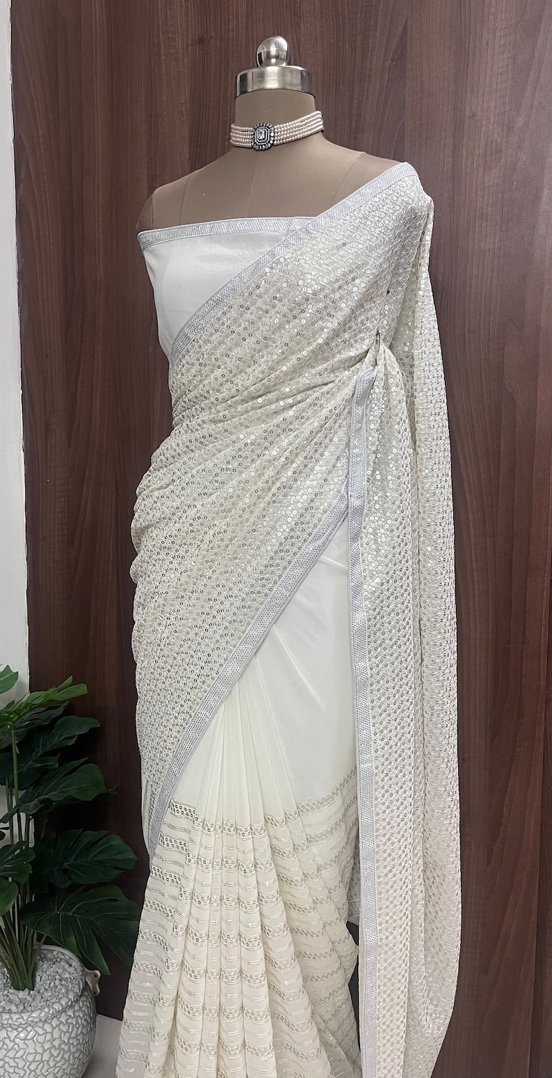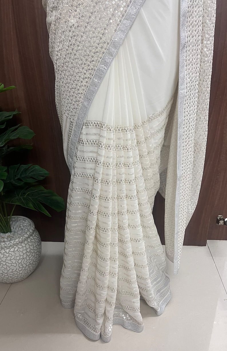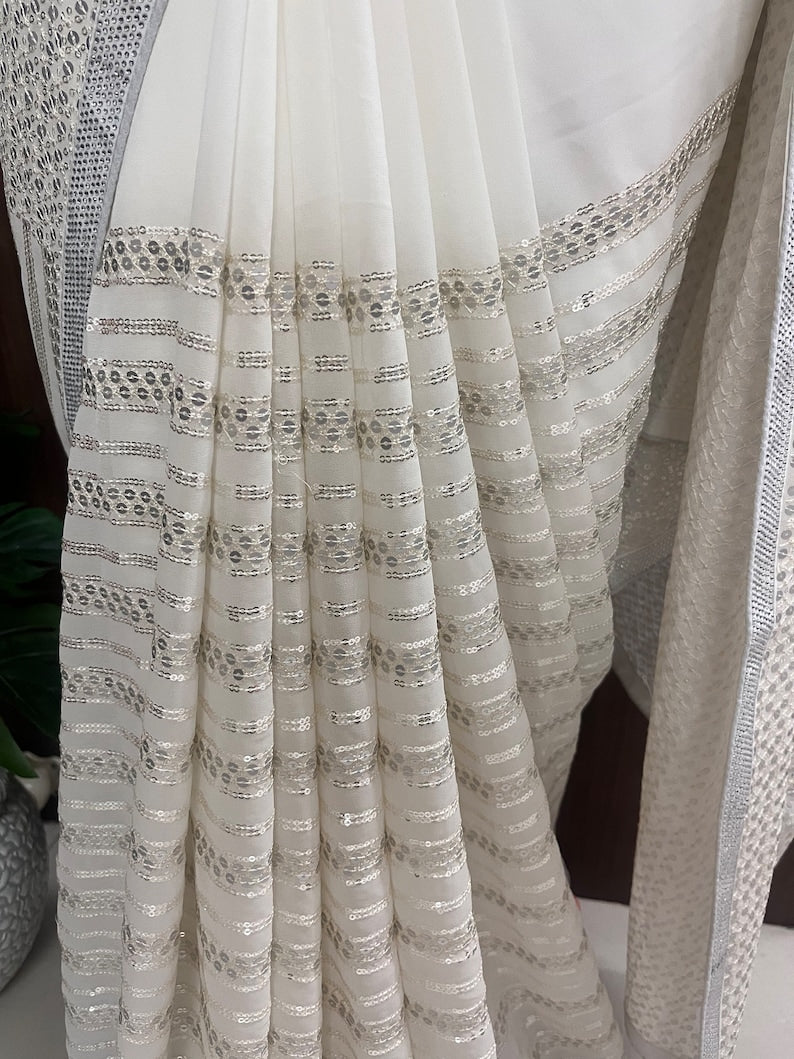 Beautiful daisy white Georgette saree with sequins work and running georgette blouse piece.