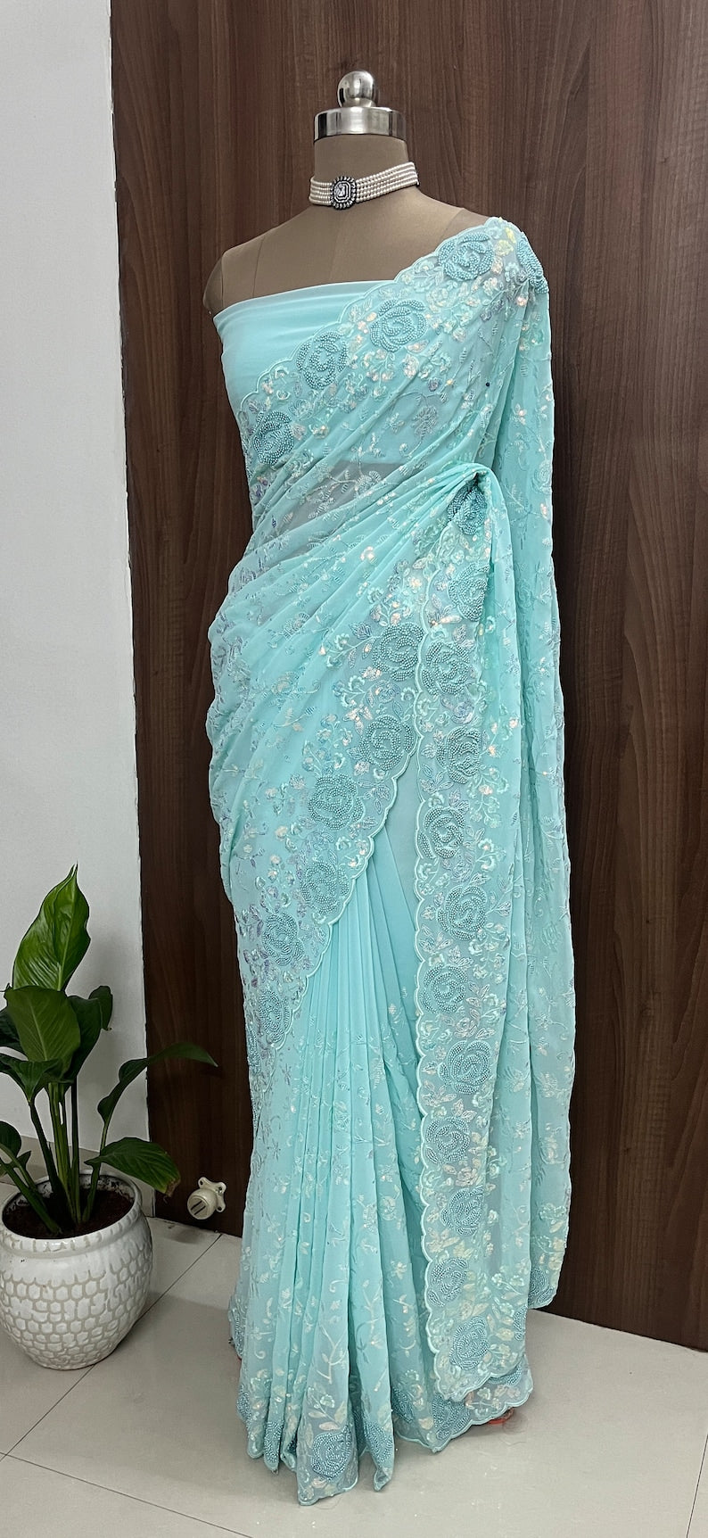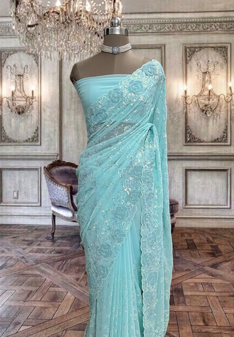 Beautiful sky blue georgette saree with beads and sequins embroidery and running blouse piece