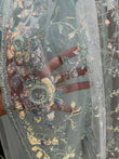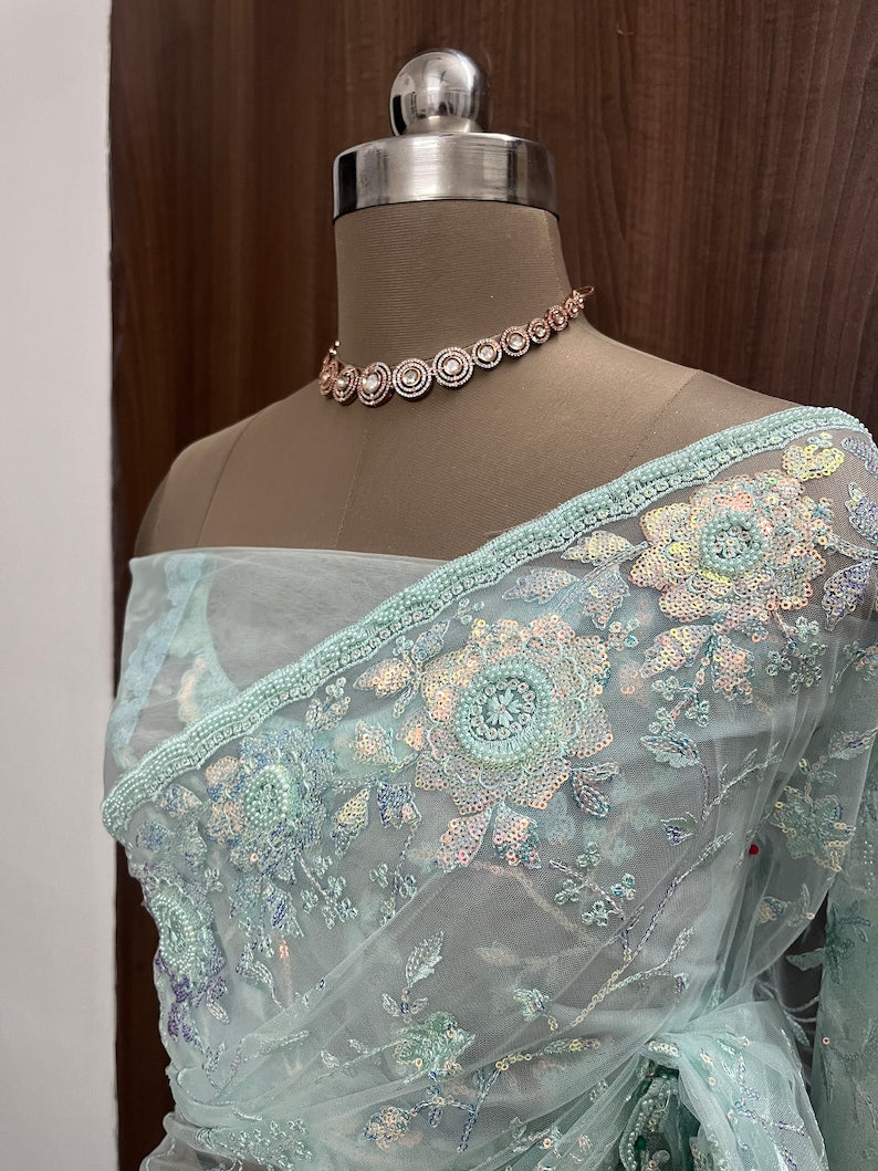 Beautiful pastel blue net saree with pearl and sequin work and matching blouse