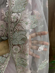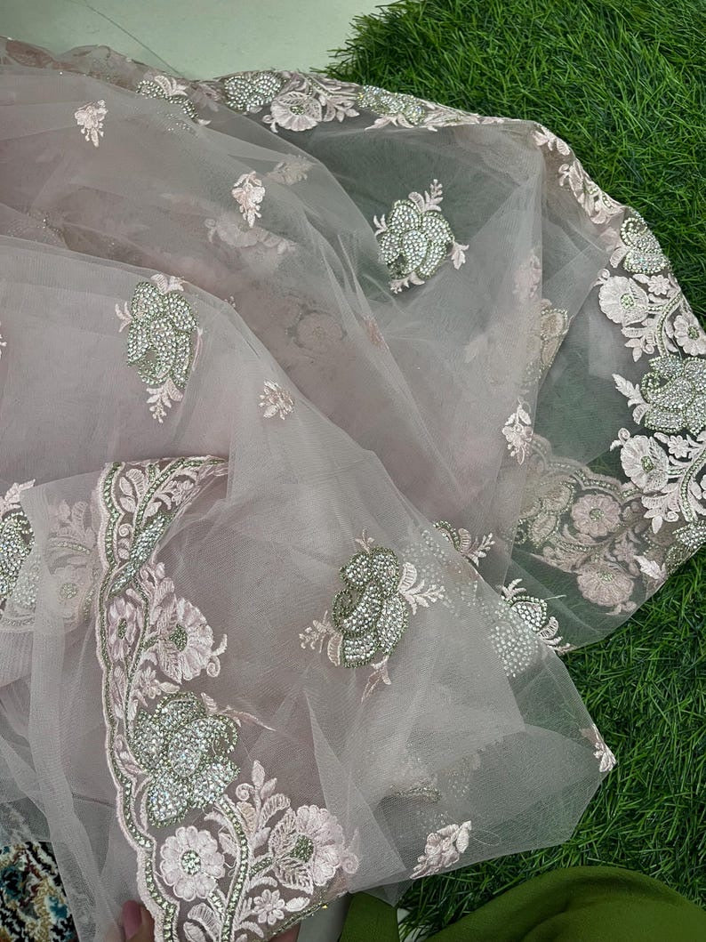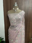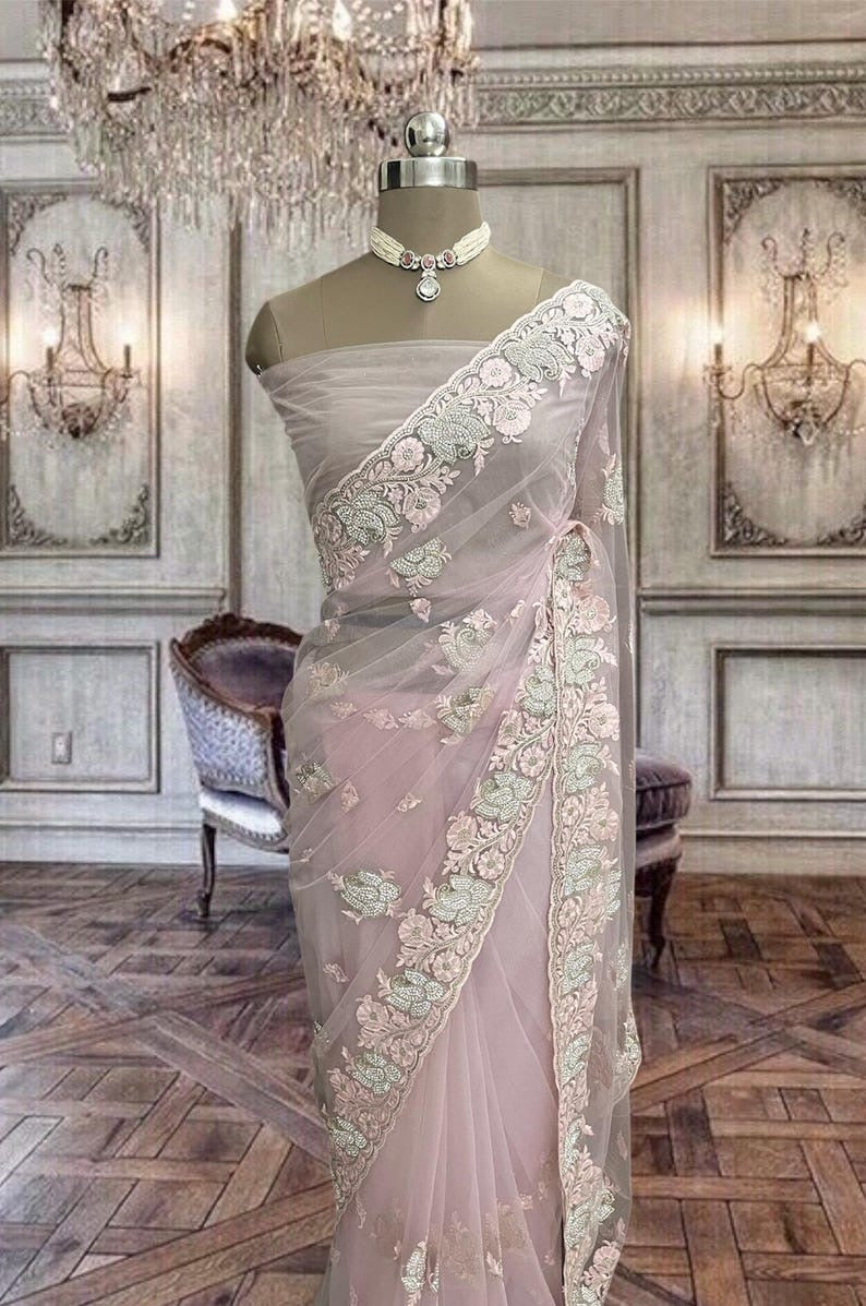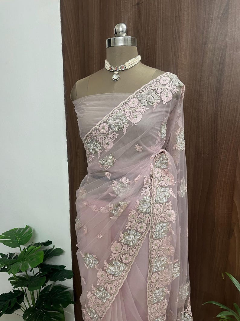 Beautiful Pastel Pink Net Saree with Thread and Stone Work