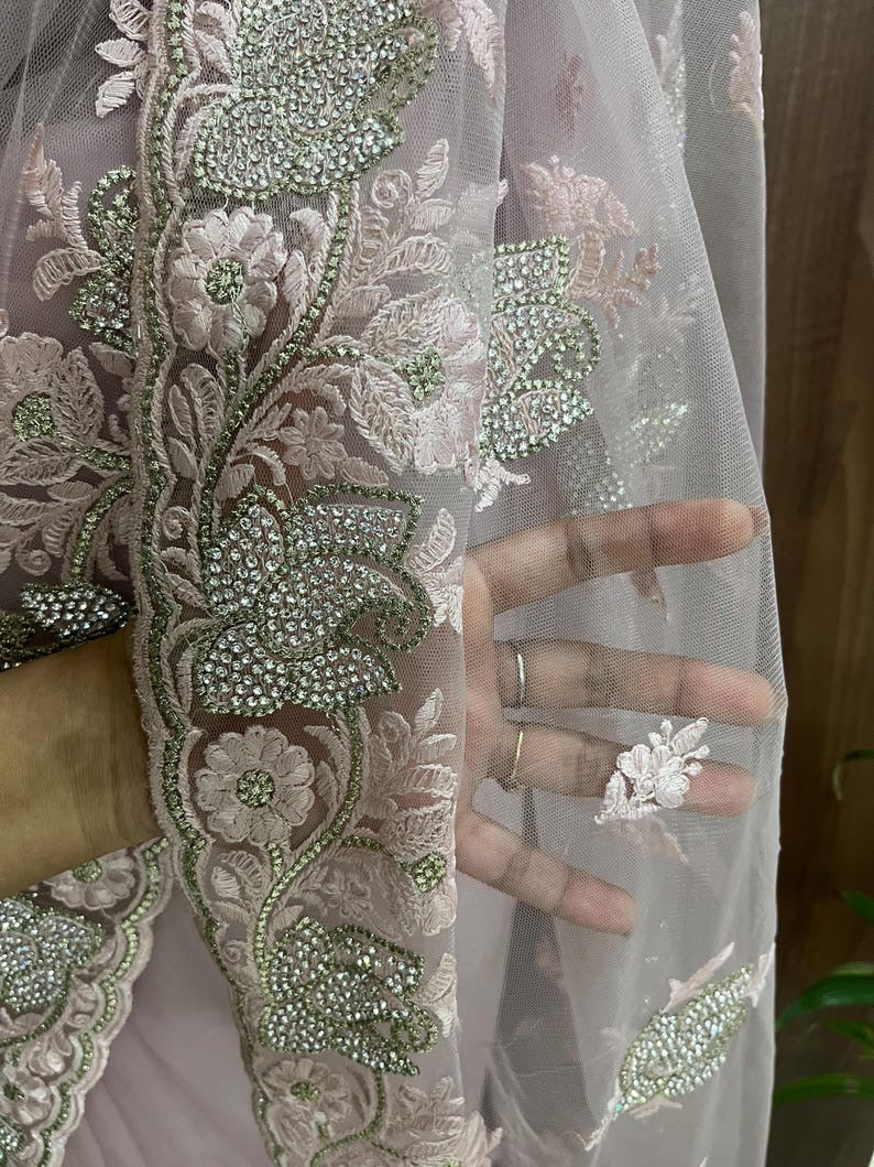 Beautiful light pink net saree with thread and stone work and running blouse piece