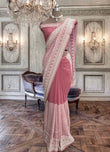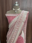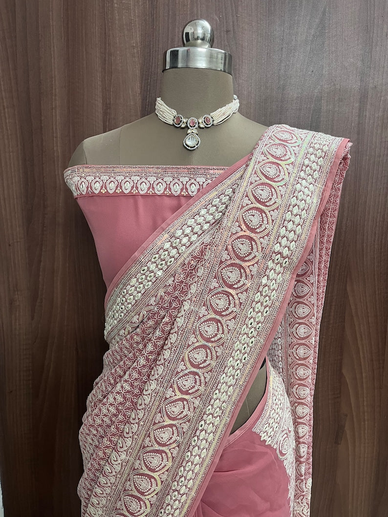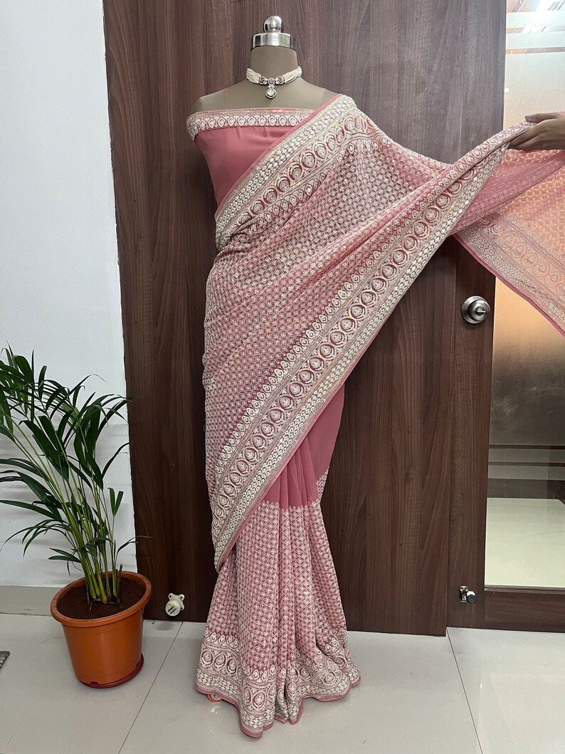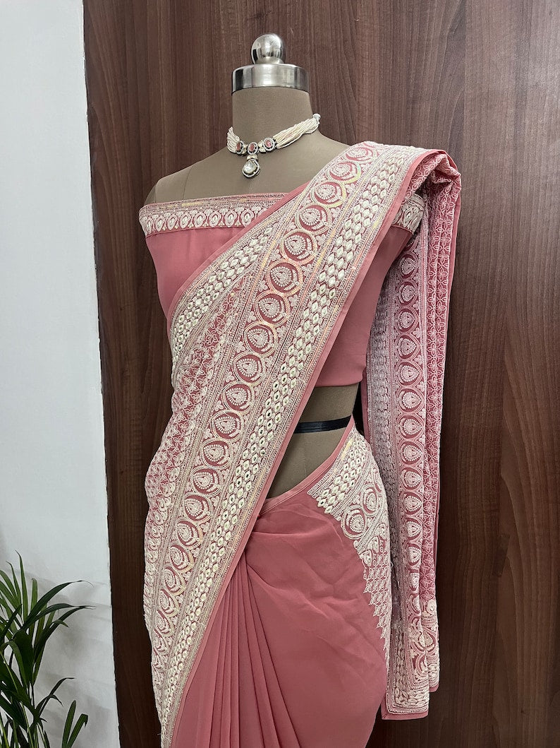 Beautiful Peach Blossom Georgette Saree With Machine Thread Work