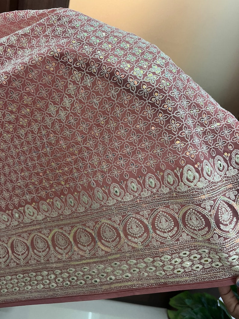 Beautiful peach blossom color georgette saree with machine thread work and blouse piece.