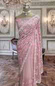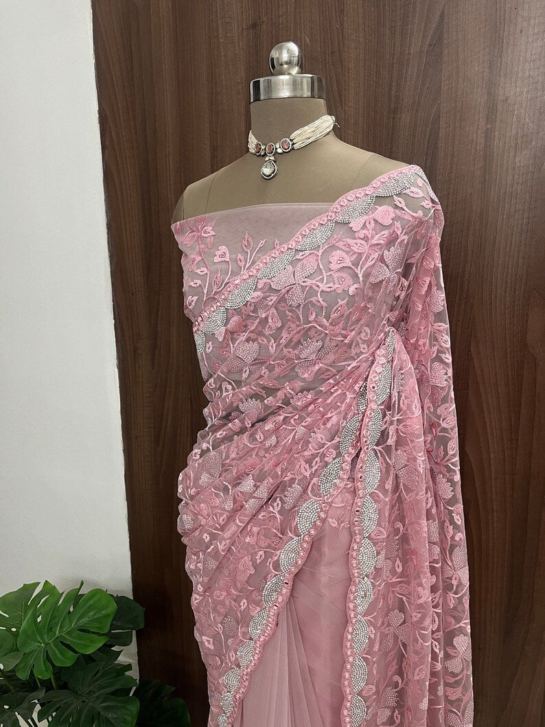 Beautiful Peach Pink Net Saree With Coloured Threads