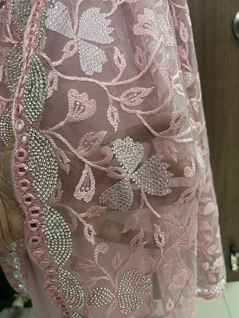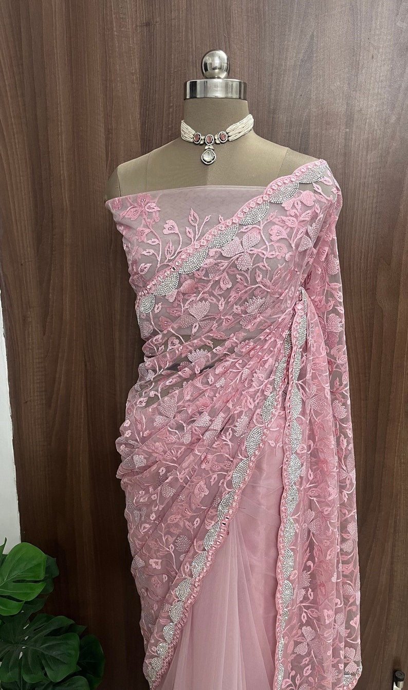Beautiful peach pink net saree with colorful threads and sport blouse piece.