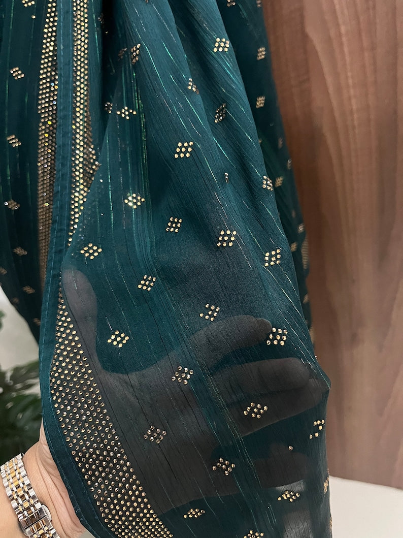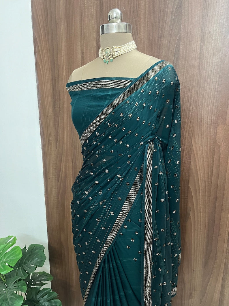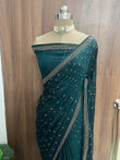 Beautiful peacock blue satin georgette saree with running blouse piece.