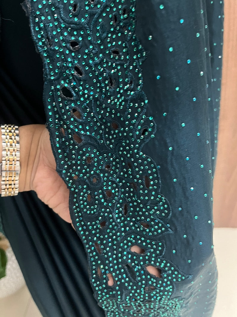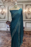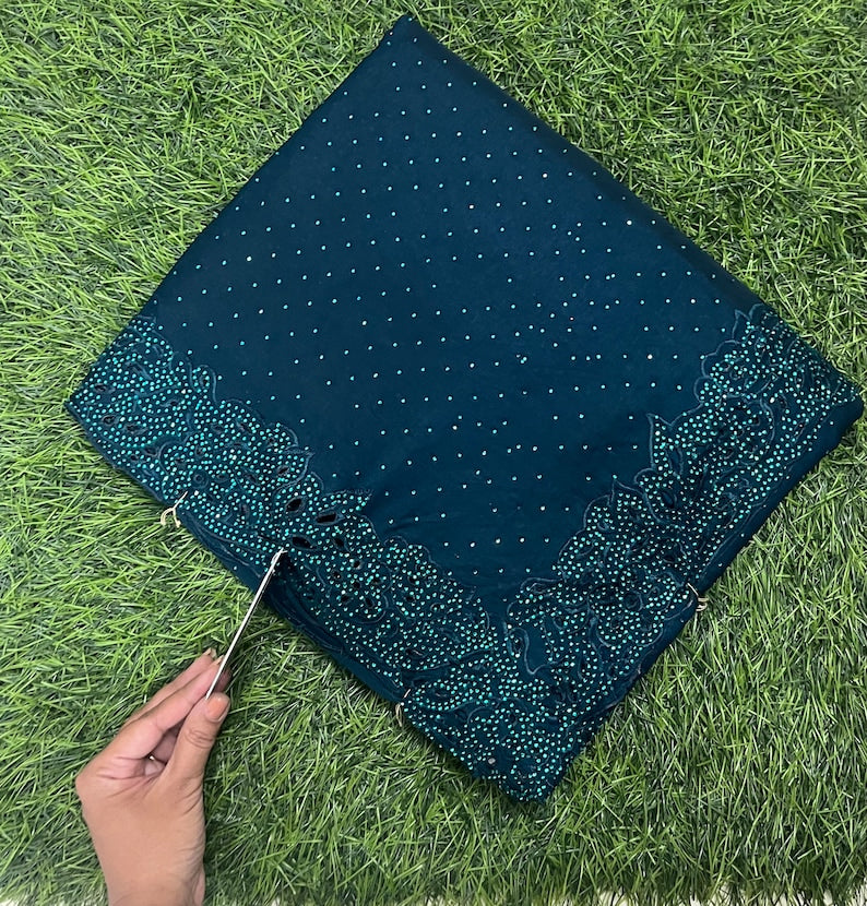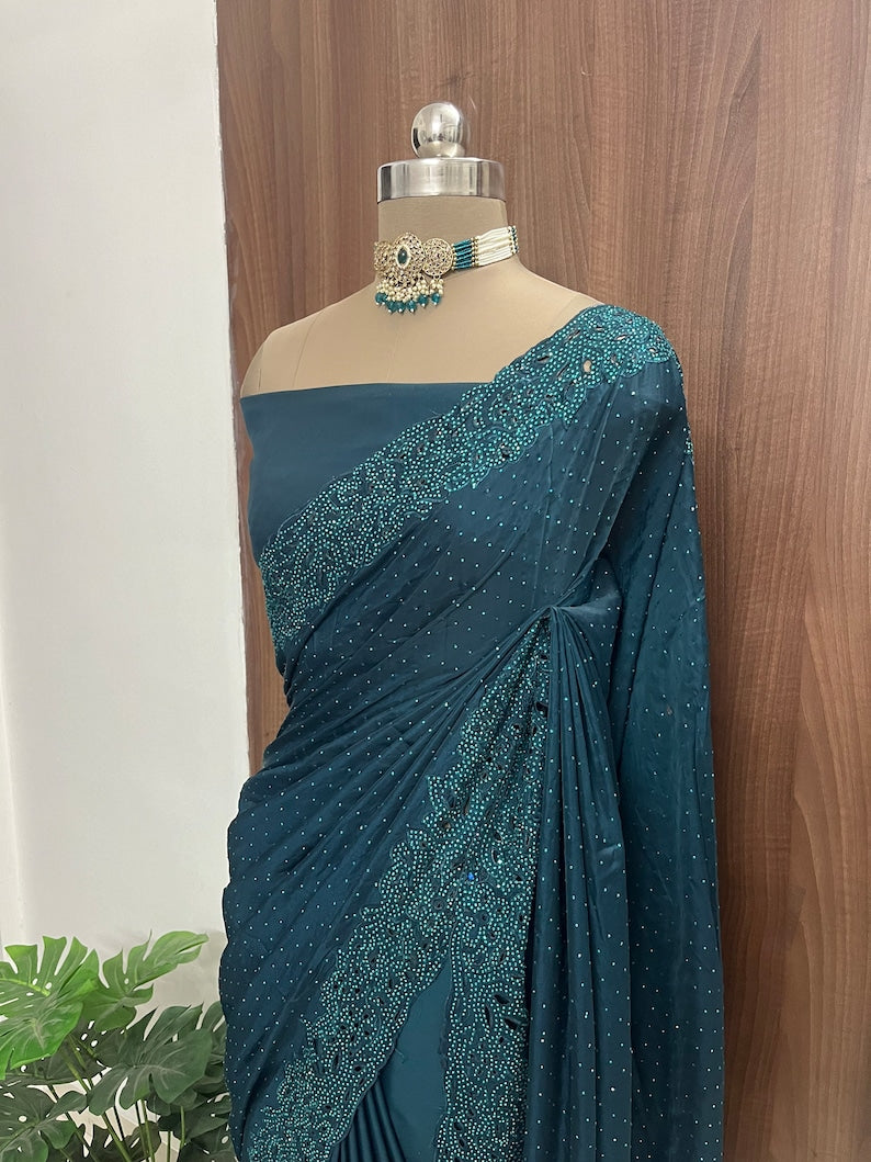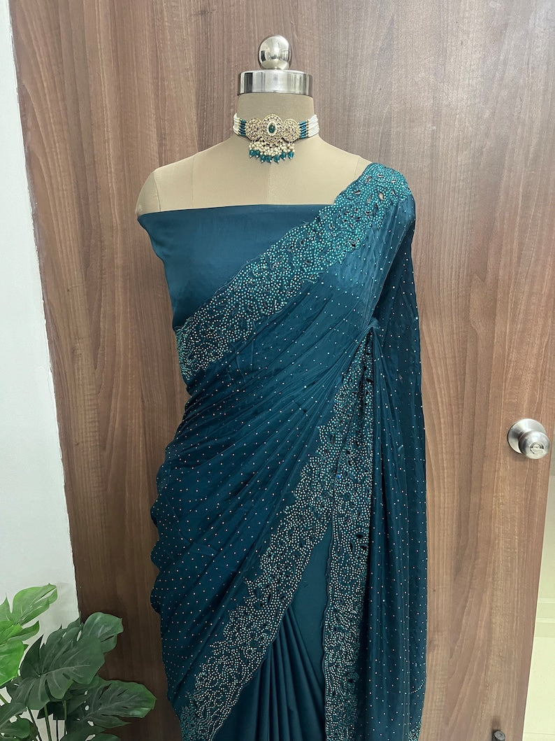 Beautiful Peacock Blue Satin Silk Cutwork Border Saree With Kundan Stone Work