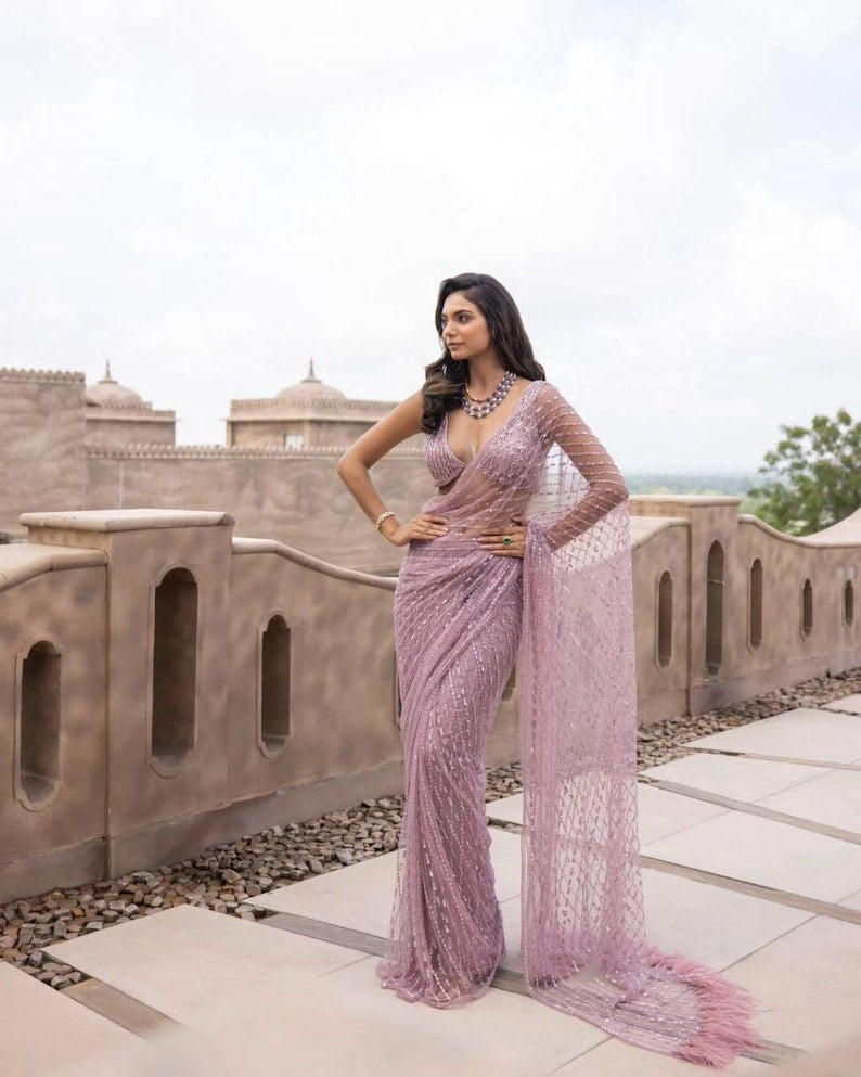 Beautiful Pink Net Saree with Thread And Sequins Work Blouse Party Wear