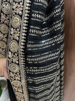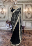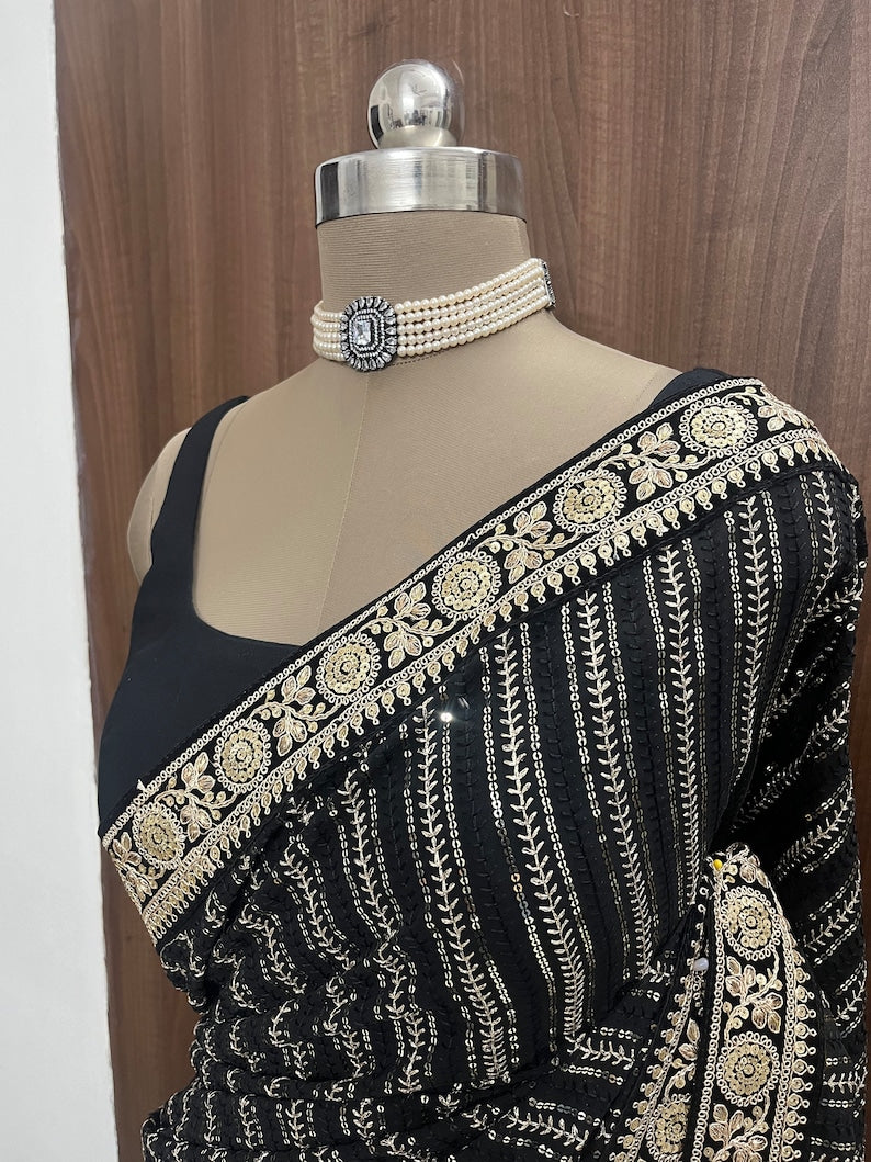 Beautiful raven black georgette saree with black sleeveless blouse stitched in it.