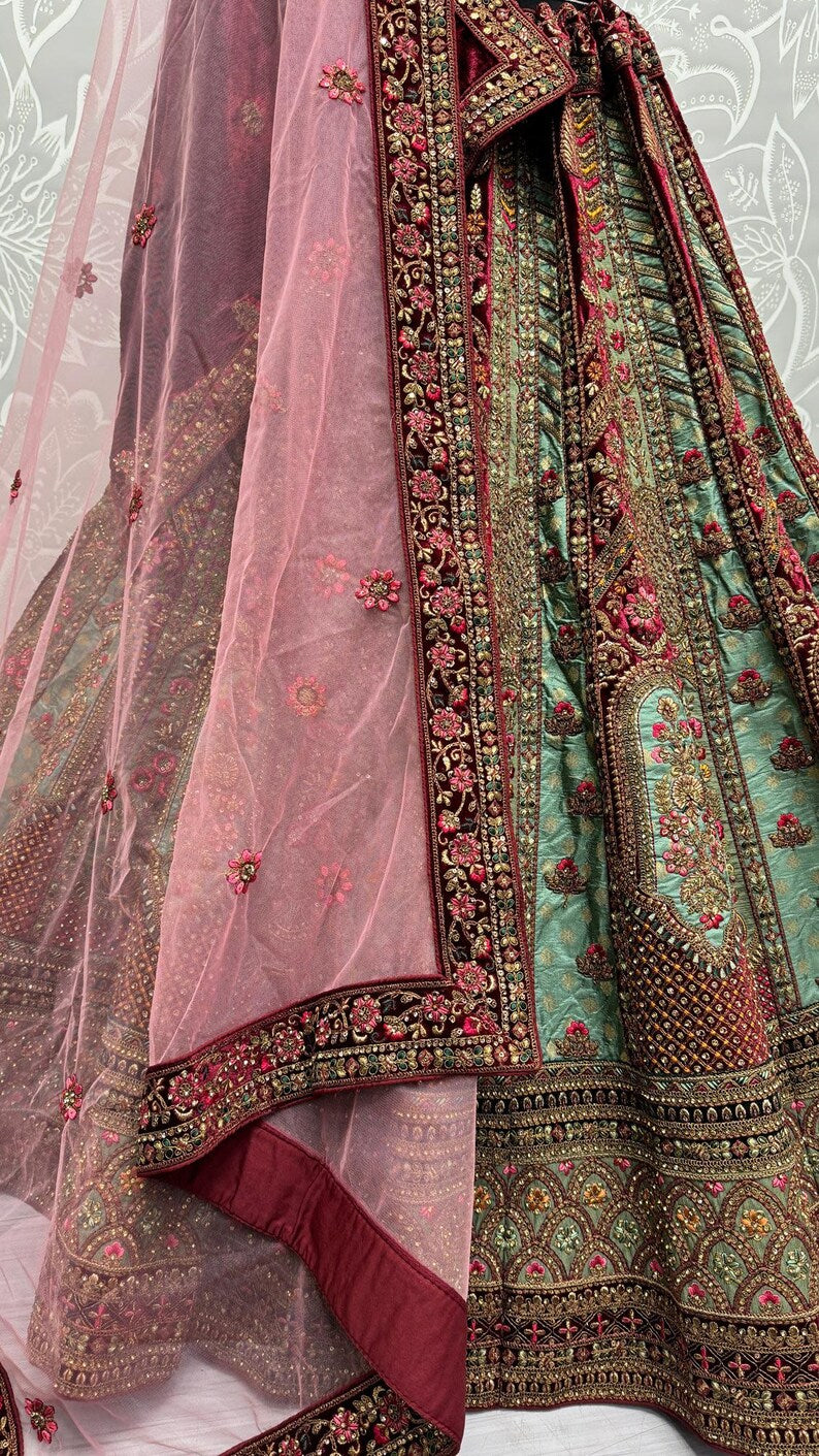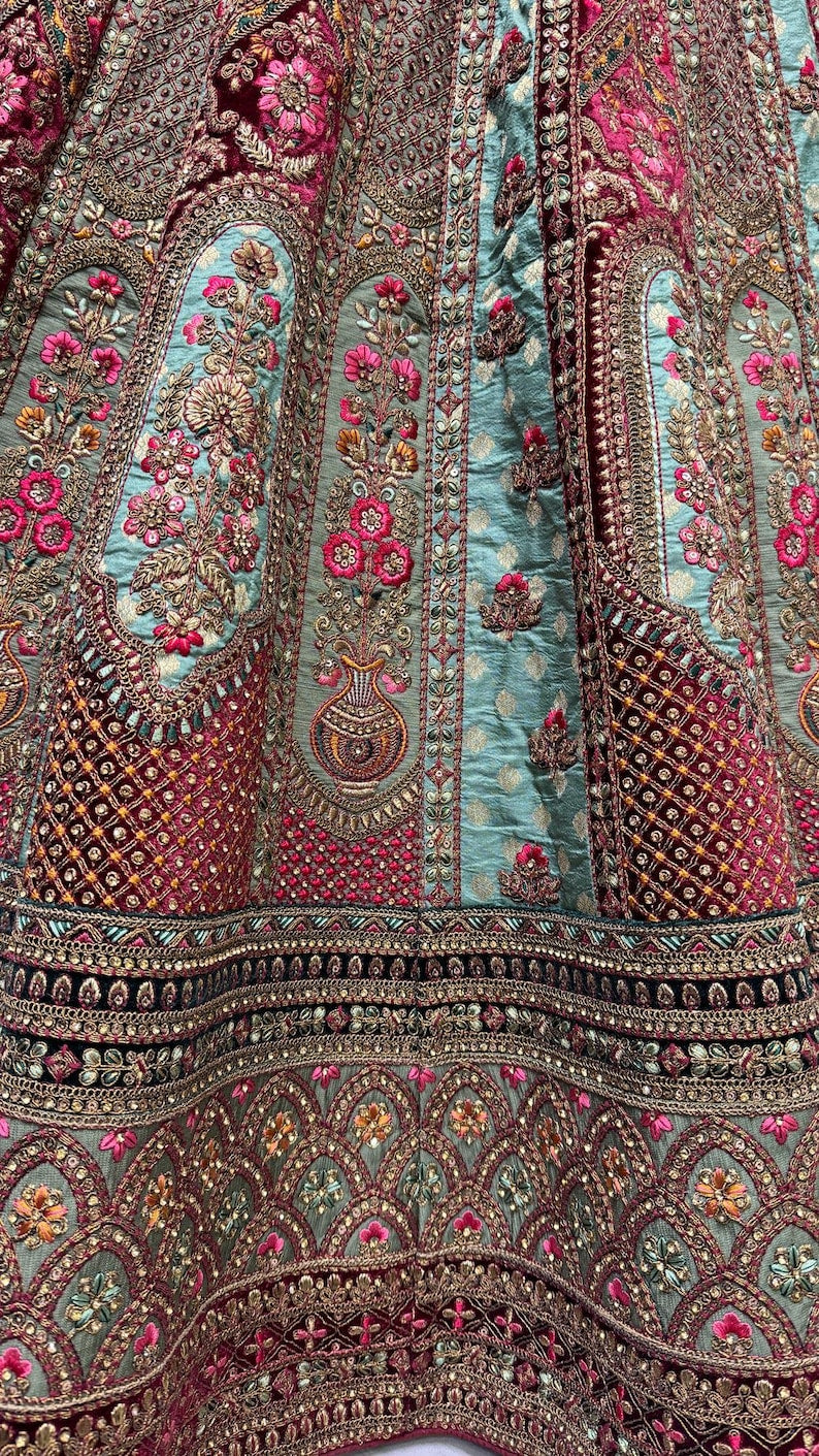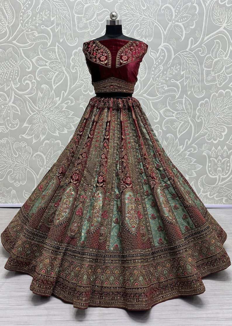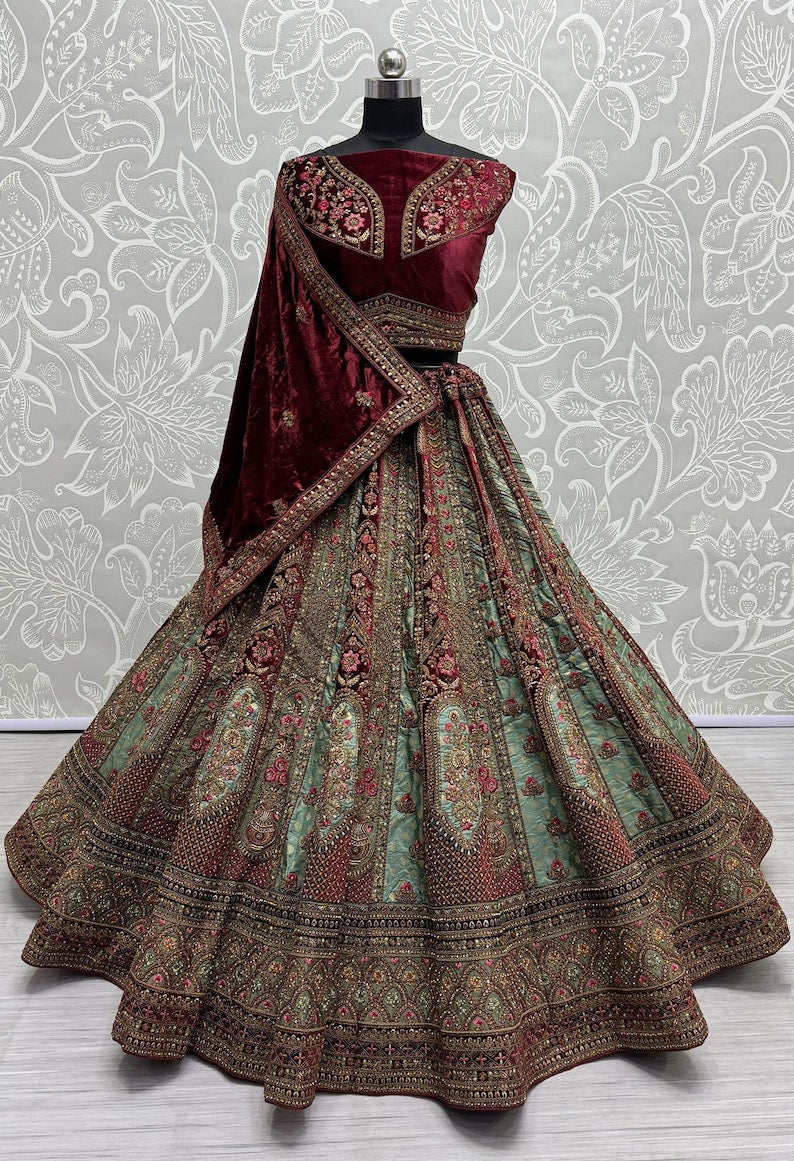 Beige and Maroon Dori, Embroidered, Patch Border, Sequins, Thread and Zari Work Velvet Lehenga Choli