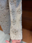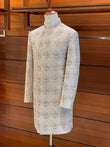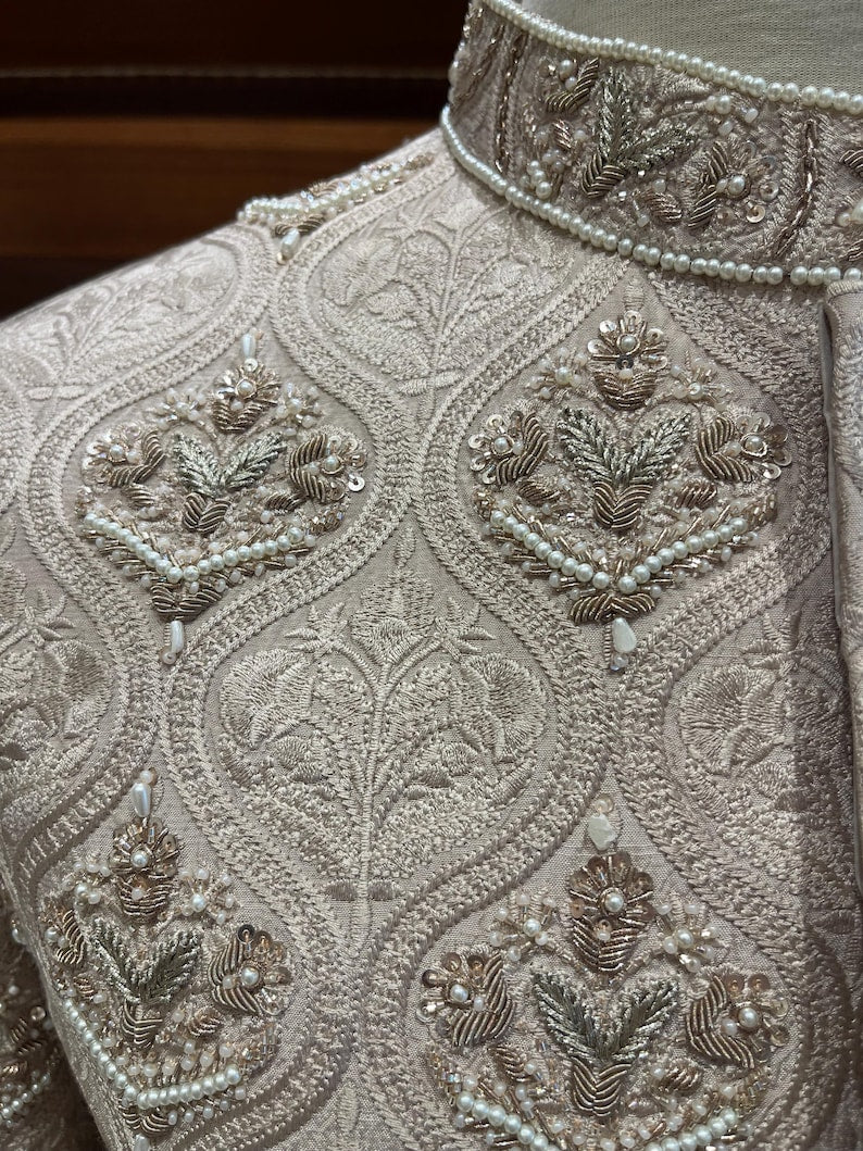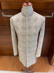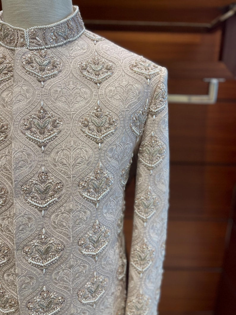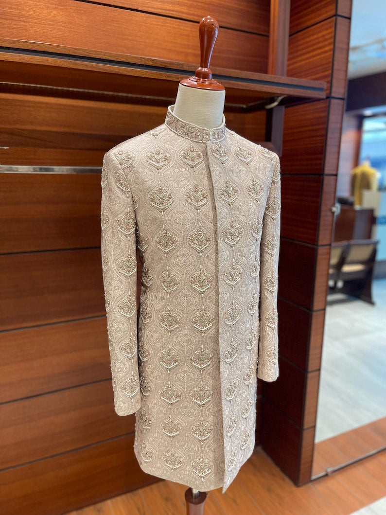 Wearing our Beige Embroidered Sherwani, you can enter your wedding day with style and grandeur. This exquisite sherwani, made from the finest silk, has a gorgeous floral embroidered print that is embellished with intricate handstitched zardozi work. This sherwani is ideal for the discriminating groom because of its rich, opulent details, which give it an extremely expensive appearance.