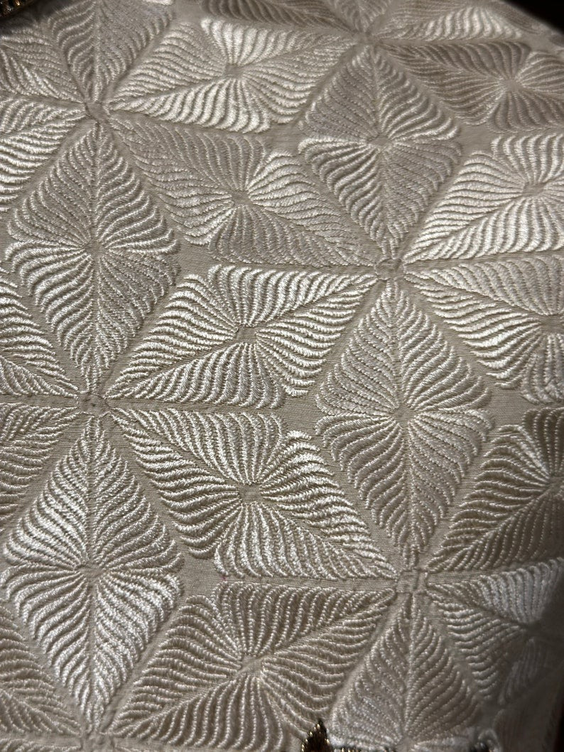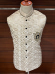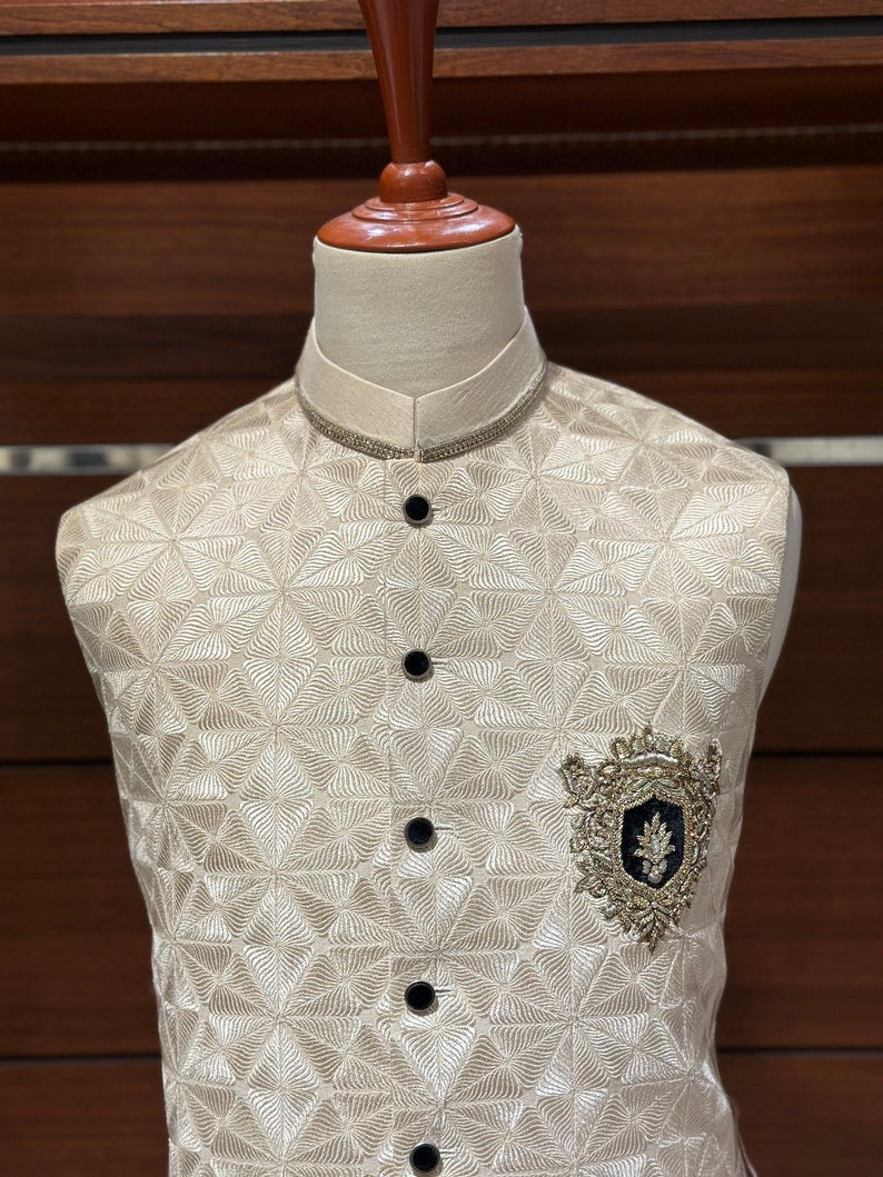 Our Beige Embroidered Karandi Waistcoat is a masterwork of style and workmanship that will elevate any ensemble. This waistcoat, which is made of finely embroidered karandi fabric, has sophisticated geometric patterns. It is a monument to classic elegance, with hand-stitched zardozi work adorning the chest and ban, contrasted with sleek black buttons.