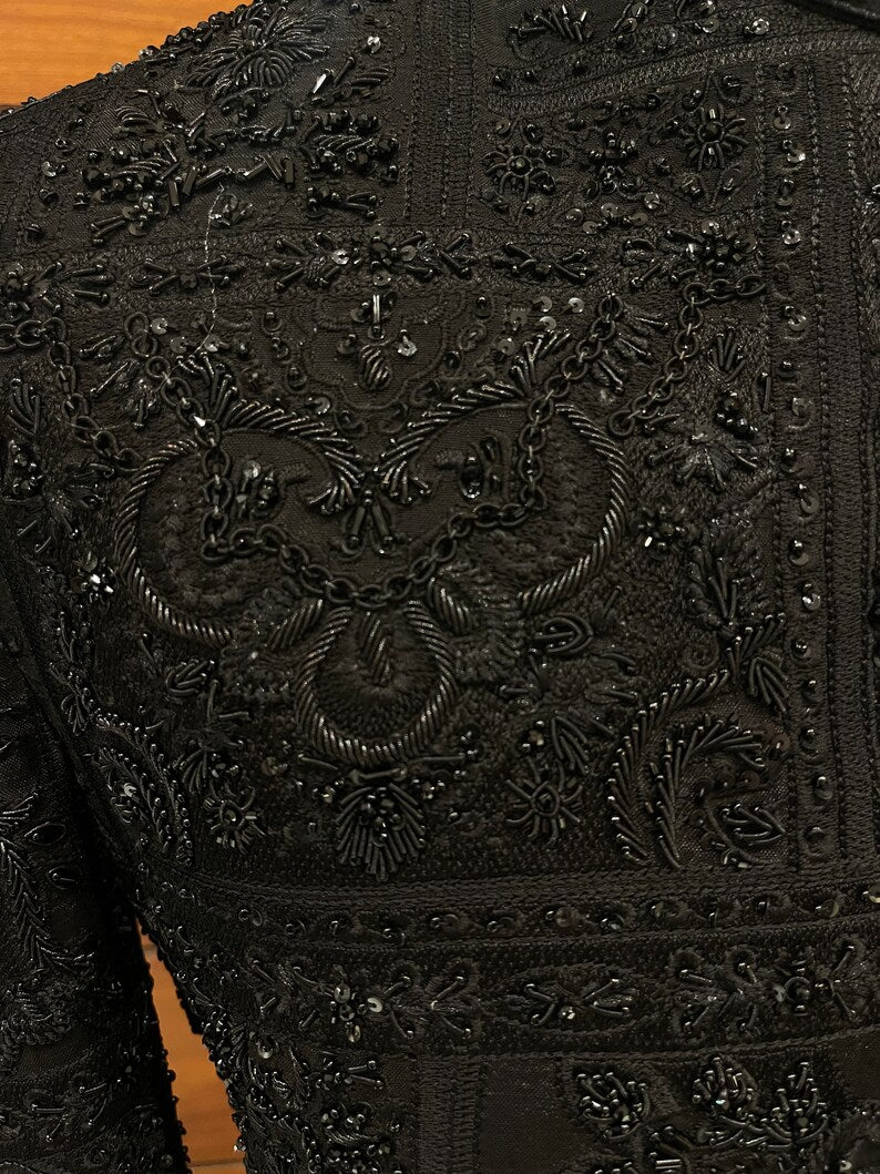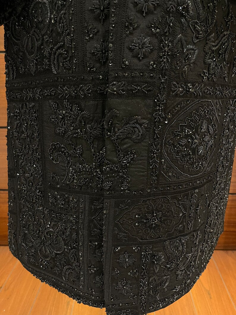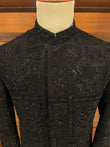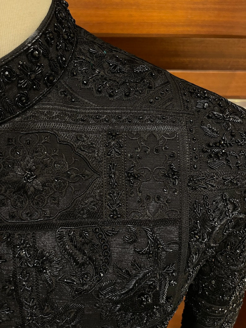 Our Black Embroidered Sherwani for Men will add a touch of luxury and tradition to your wedding day ensemble. This amazing piece's base is made of traditional silk embroidery that is carefully hand-stitched zardozi embellishments.