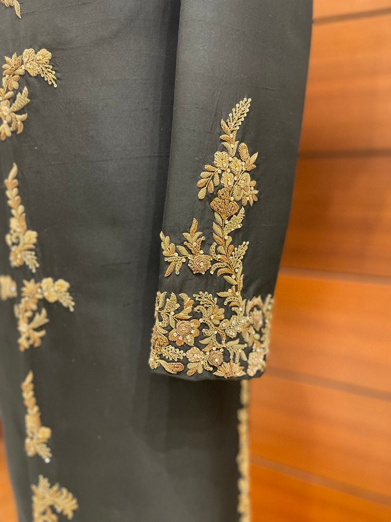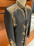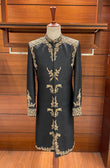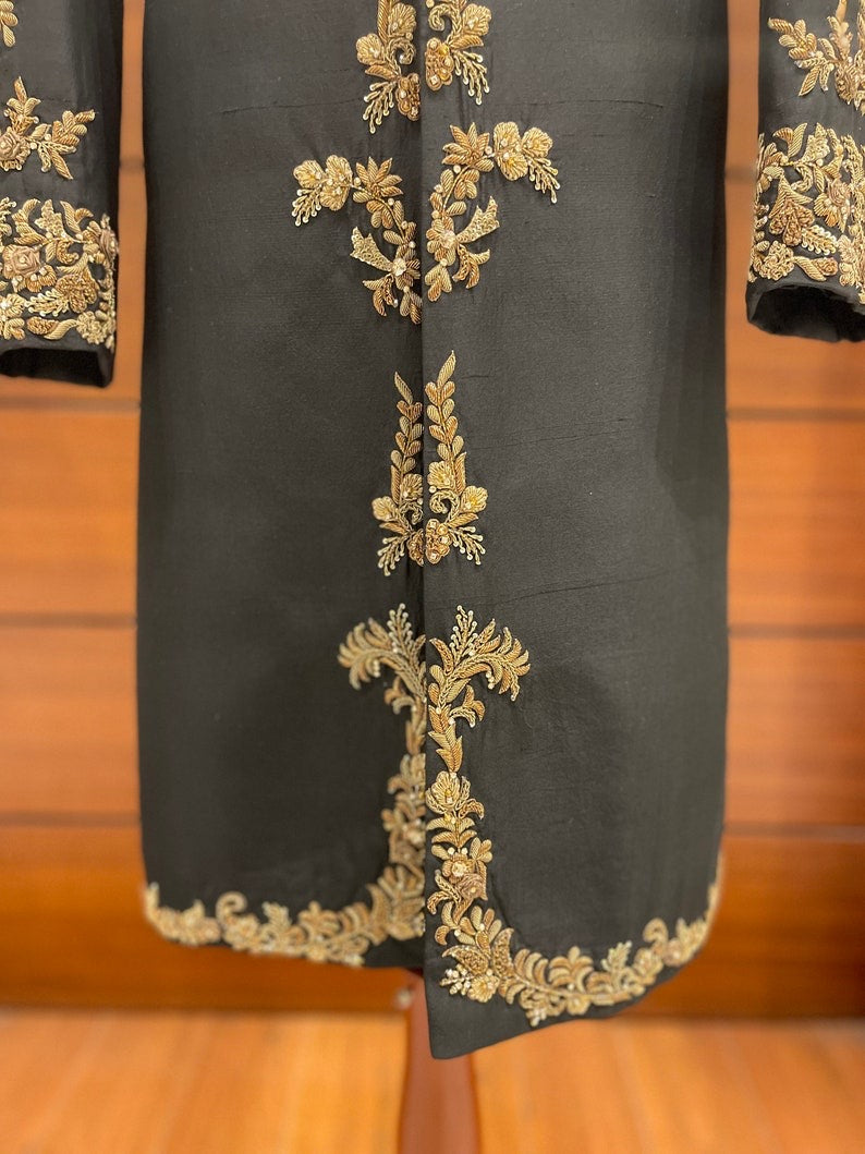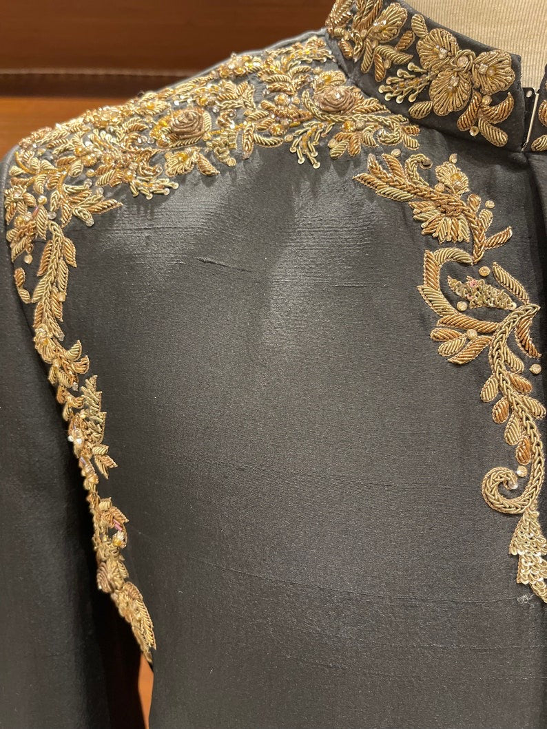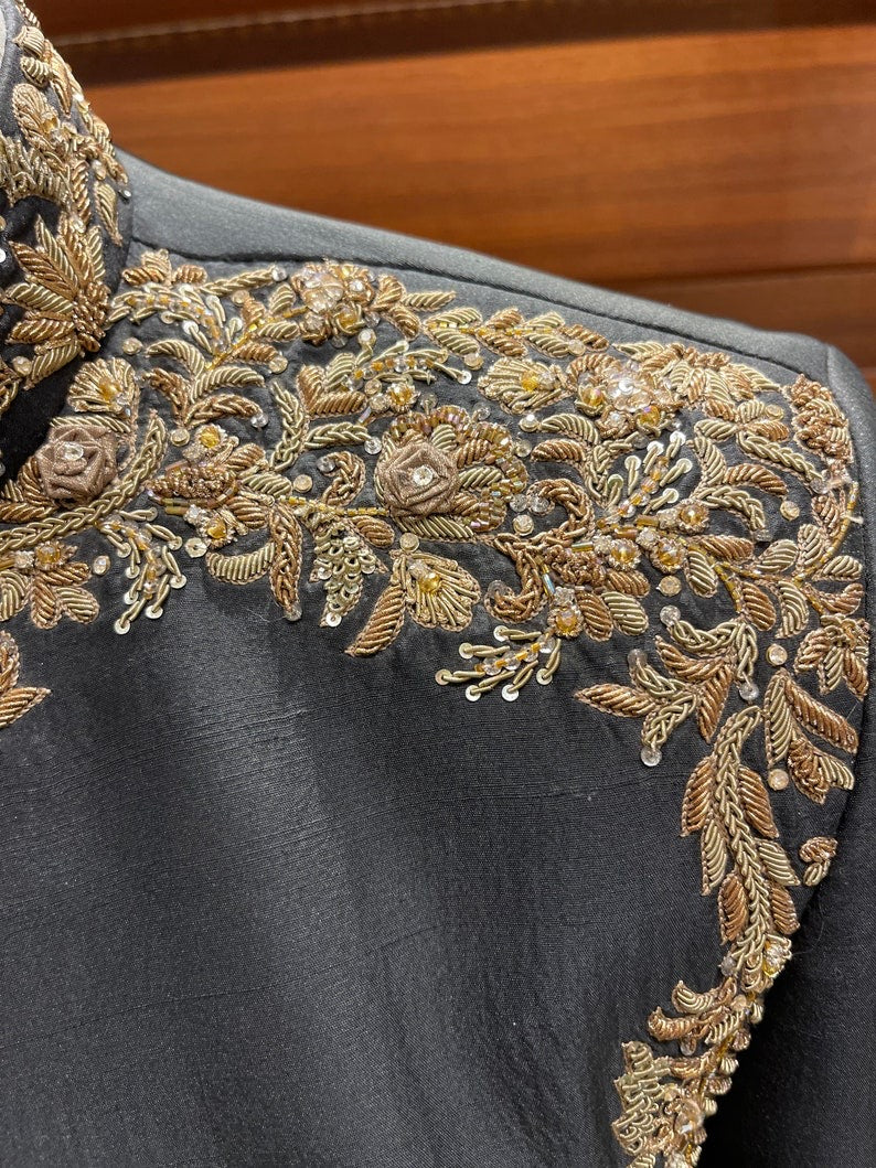 A masterpiece designed for the discriminating groom, our Black Raw Silk embroidered sherwani for men will turn heads as you enter the room. The base is made of opulent 80-gram pure raw silk, which is exquisitely printed with a captivating zardozi floral design that cascades softly over the sherwani. With the finest materials used in the zardozi technique, including a variety of zari in an alluring golden colour scheme, every detail exudes refinement.