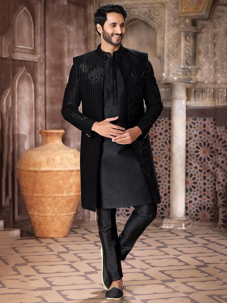 Black dupion silk sherwani with a dupion silk bottom and matching art silk jacket. Plain sherwani and bottom, featuring a stylish chinese collar neck and full sleeves intricate resham thread and sequins work on the jacket enhances its elegance. Perfect for grand occasions.