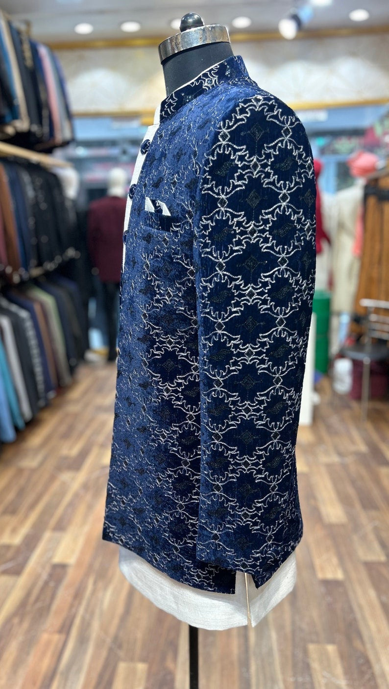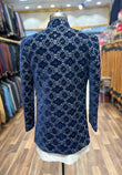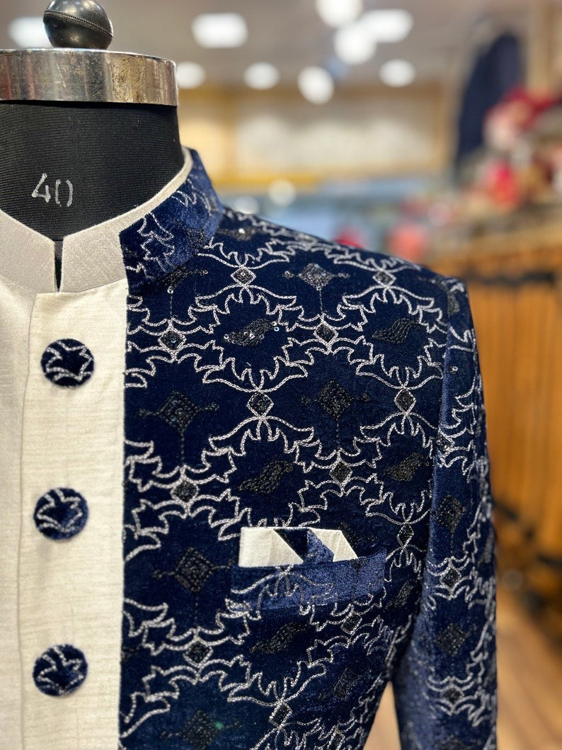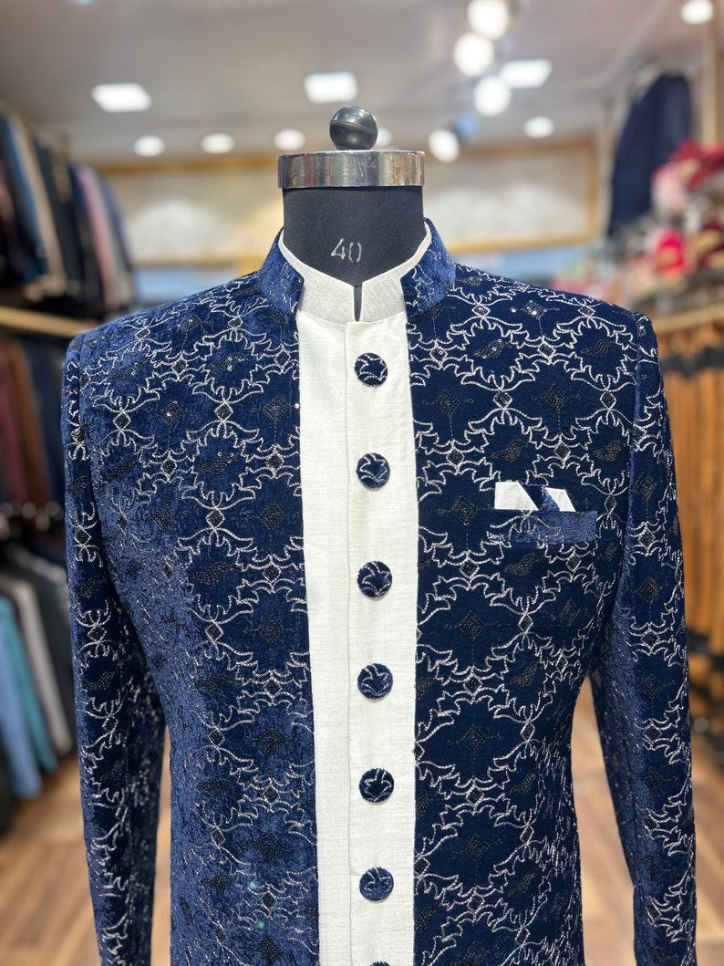 has mandarin collar and long sleeves with symmetric hem and multiple slits it has embroidered buttons made of same work as in sherwani
