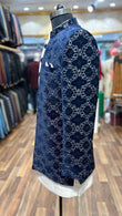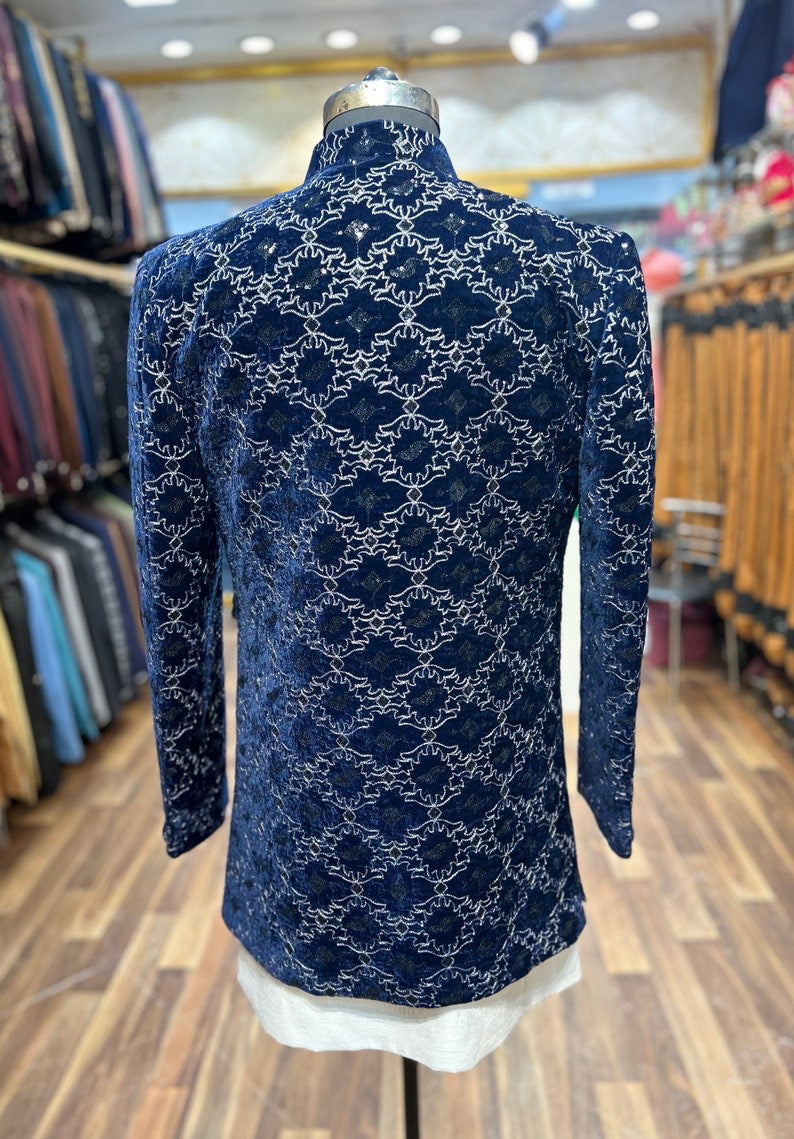 Front open Jacket has mandarin collar and long sleeves with symmetric hem and multiple slits it has all over multicoloured resham thread embroidery that make its sporting and beautiful