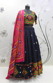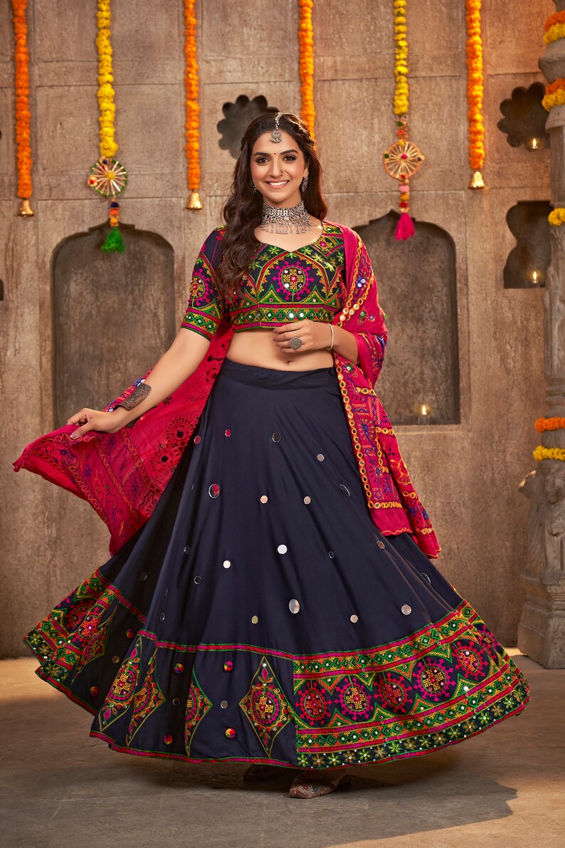- Available with an Semi-Stitched Muslin Cotton Choli in Black and a Poly Cotton Dupatta in Rust, Crafted in Sweetheart Neck and Half Sleeve