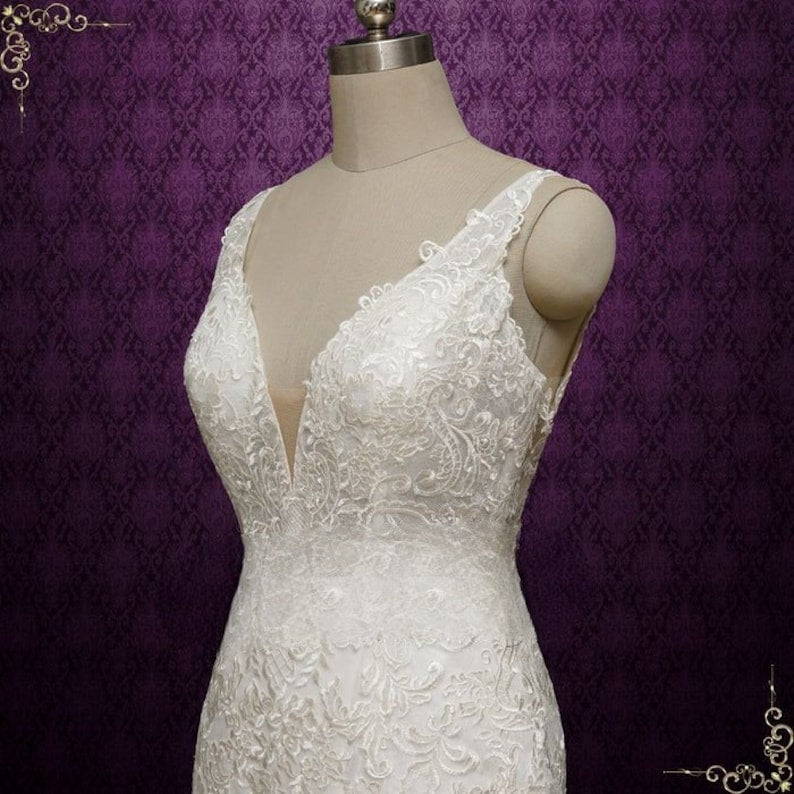 Look elegantly sexy in this stunning on your special day in this beautiful French Lace wedding dress. Crafted with exquisite embroidered lace and featuring a gorgeous plunging v neckline and open back, all come together with a fitted silhouette.