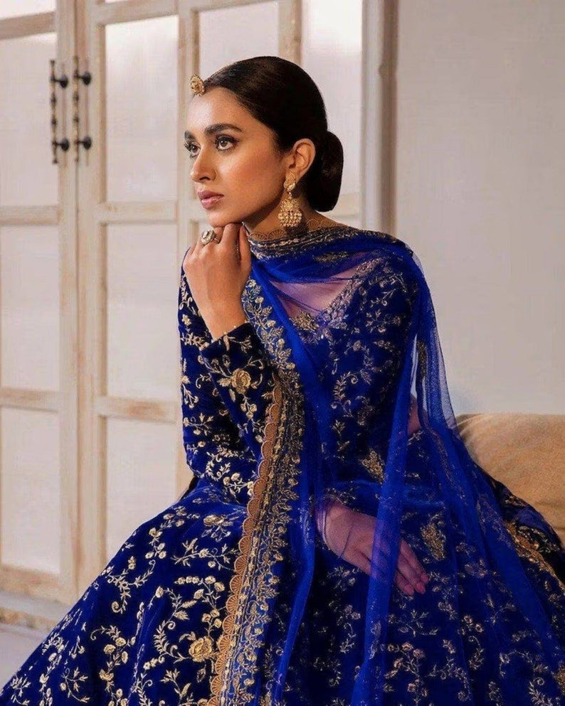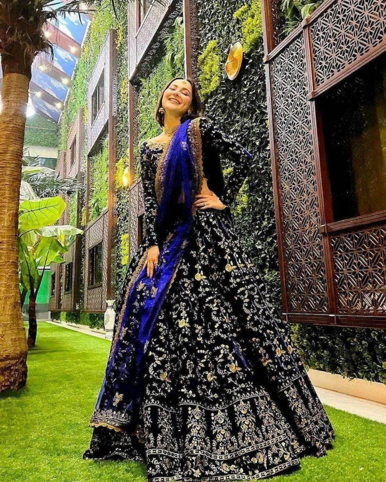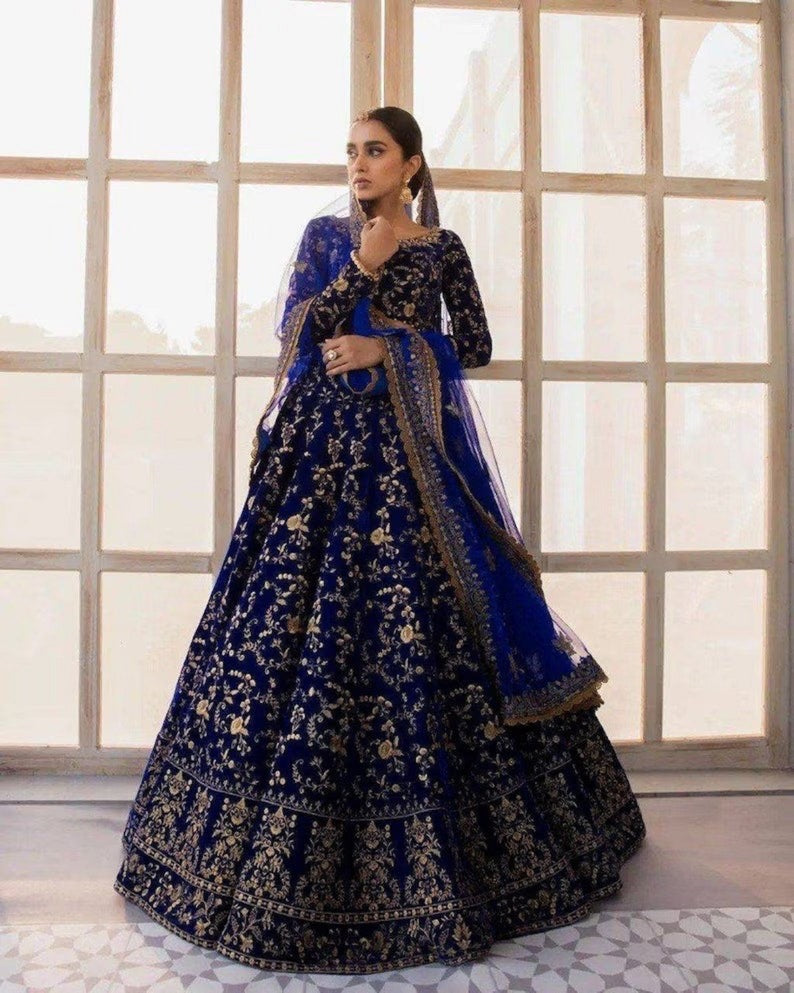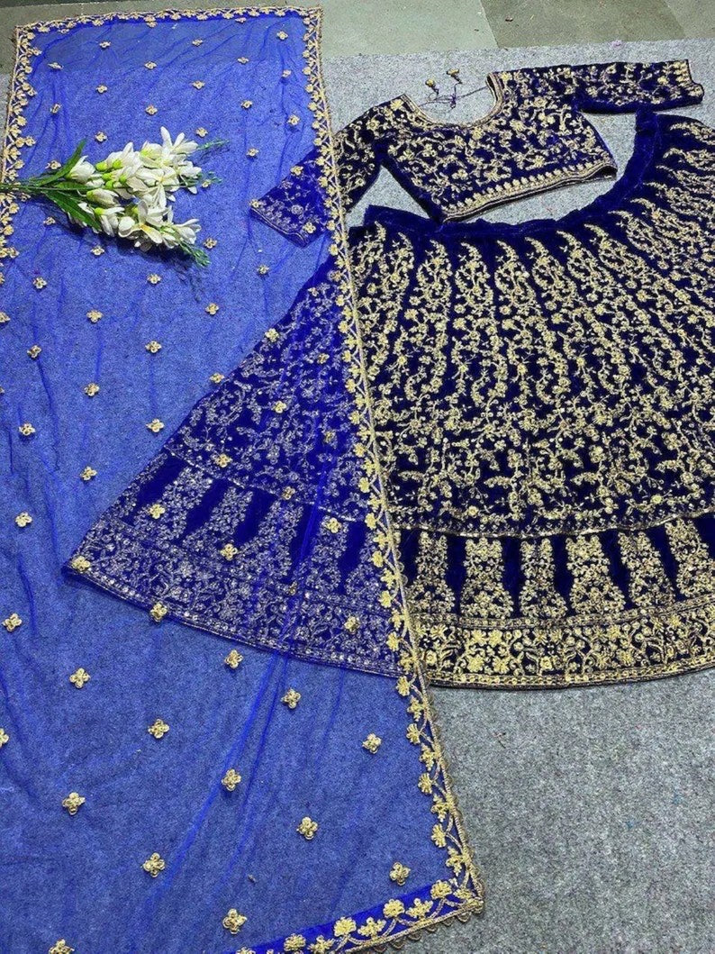 Bollywood Model Velvet Embroidery wedding lehenga in blue color