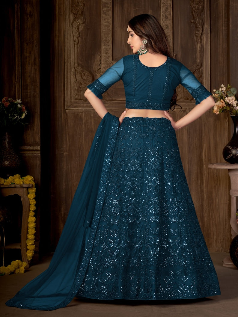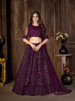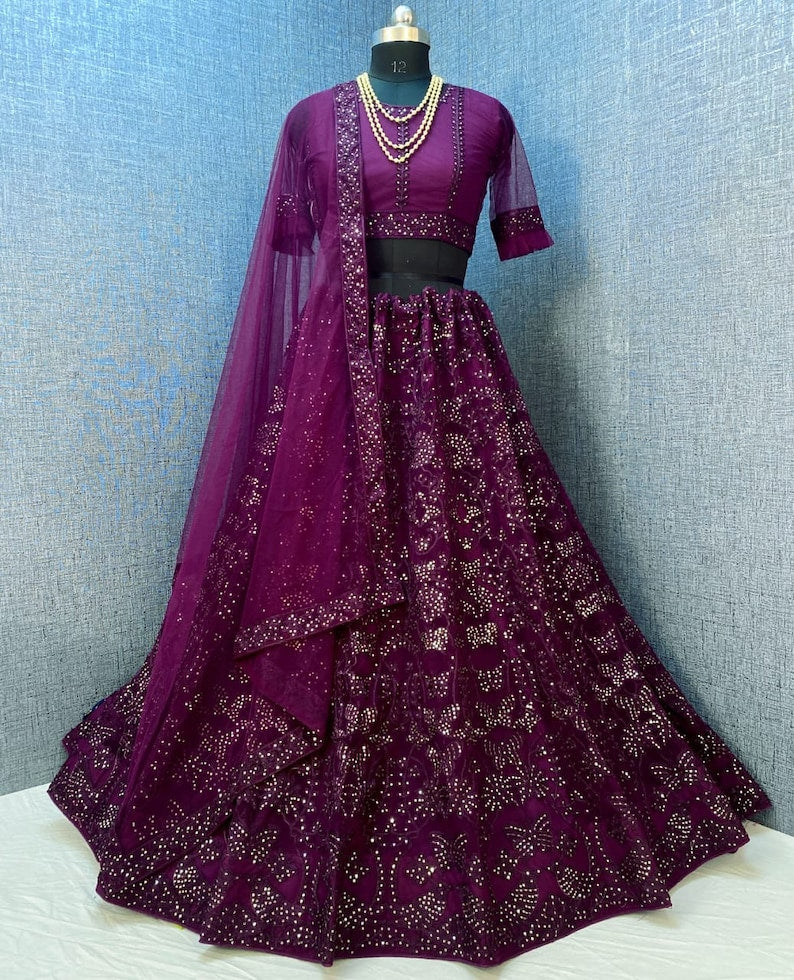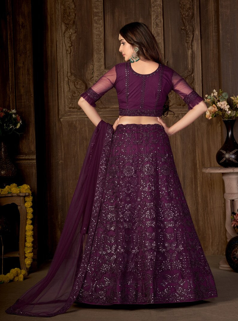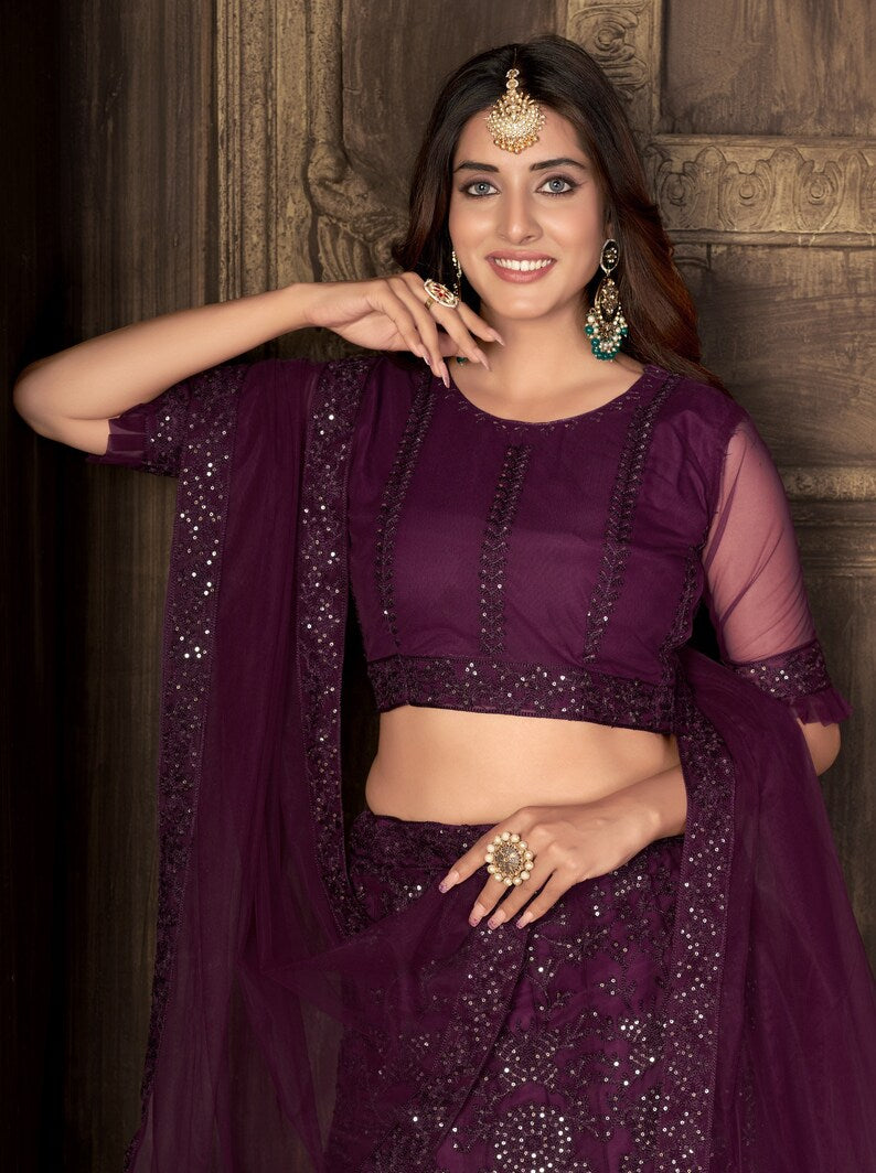 About Product :- Beautiful gorgeous beauty adorning this Wine colored net lehenga crafted with thread, foil mirror and sequins embroidery all over. Paired with a matching colored net choli and a Wine colored net dupatta, both in similar work embroidery .