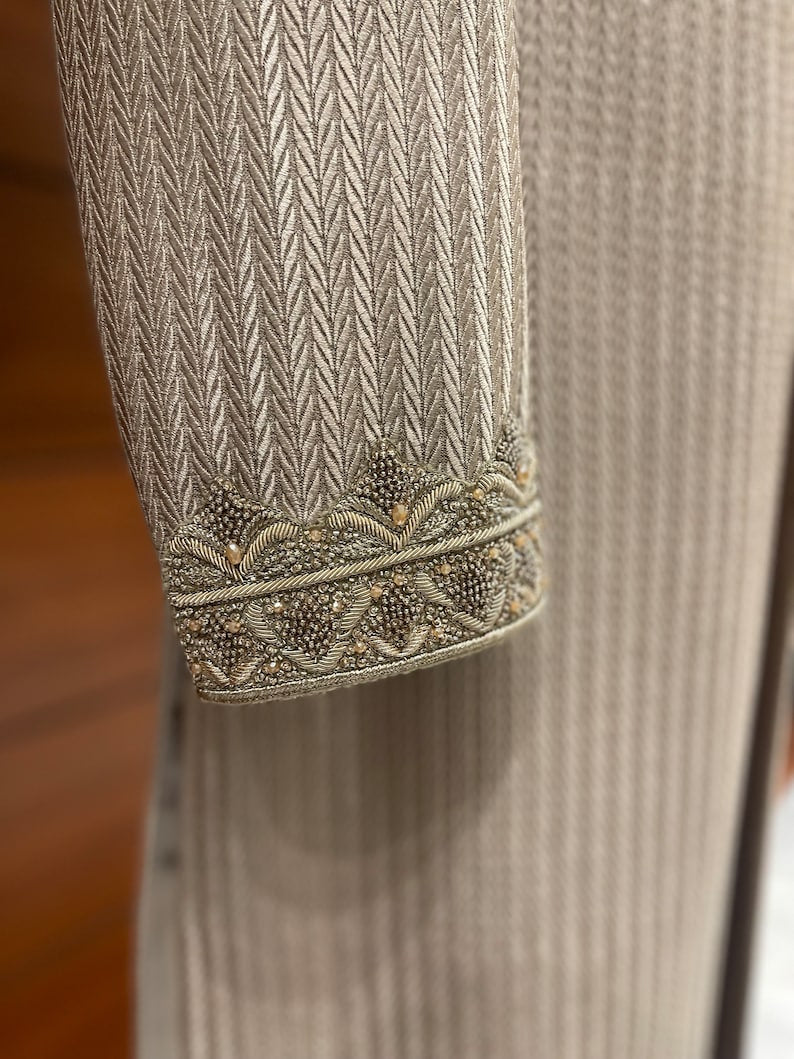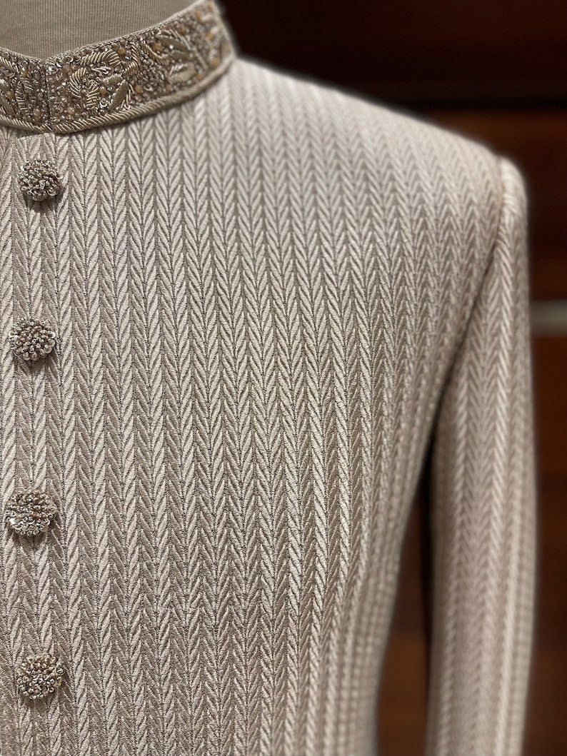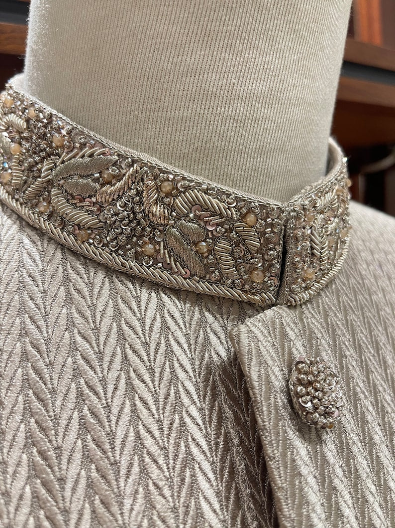 With our captivating combination of elegance and history, the Beige Embroidered Sherwani for men will make you the centre of attention. A visually compelling narrative is created by the base, which is covered with a gorgeous floral print that cascades from top to bottom. This sherwani is a true masterpiece thanks to the hand-stitched zardozi embroidery on the hem and cuffs, which gives a touch of refinement.