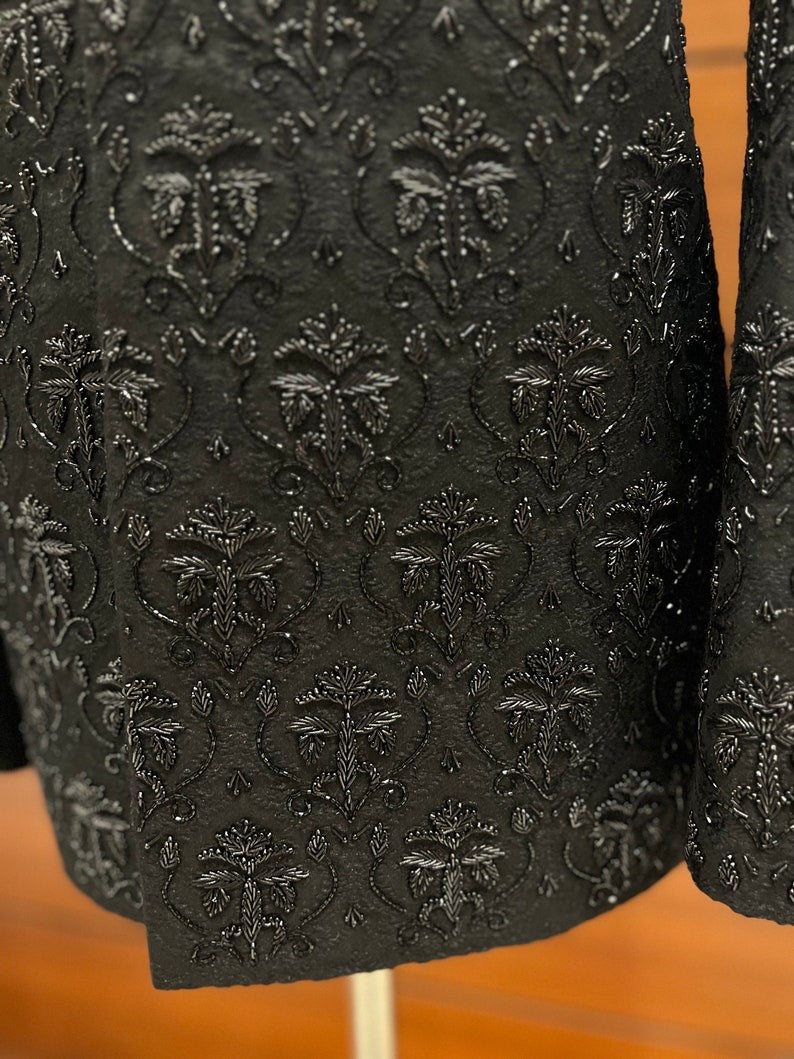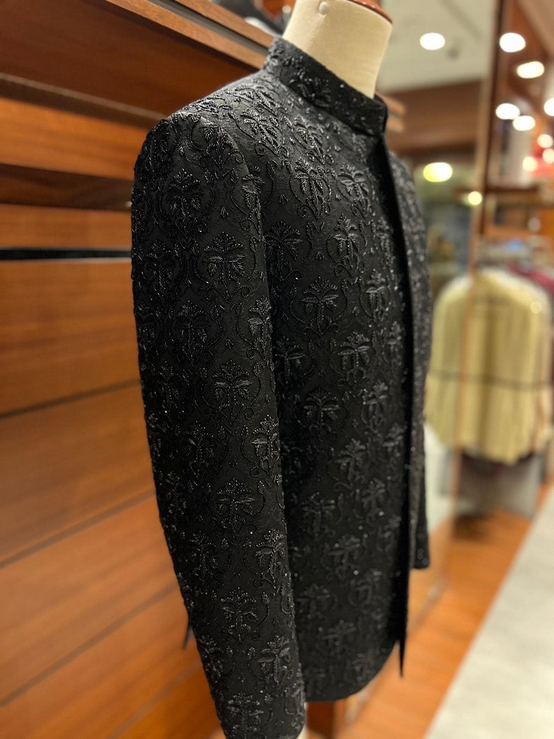 Presenting our Black Embroidered Prince Coat, a magnificent piece of art embellished with exquisite hand-stitched zardozi work and made from the finest silk. This sherwani is a representation of sophistication because of the grace of the black cutdana and zardozi spring, which are enhanced by the black zari materials. Specifically created for the groom on his wedding day, we promise to give not just excellent but exceptional quality.