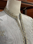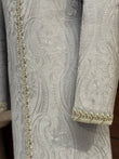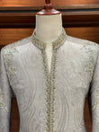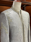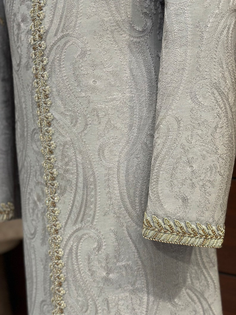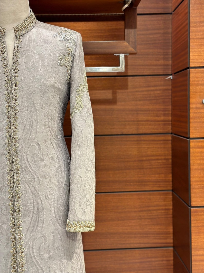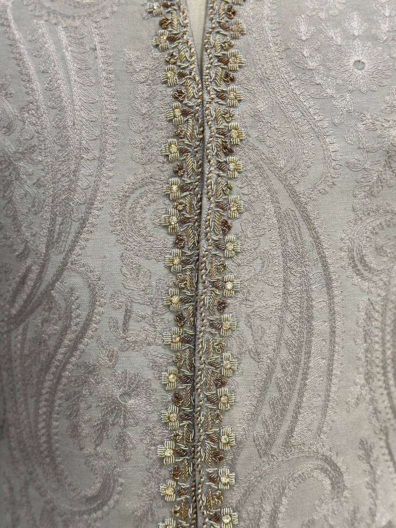 Step into sophistication with our Classic Grey Karandi Sherwani. Crafted from pure self embroidered karandi, adorned with hand stitched zardozi work in collar, cuffs, arms and bail on the skirting of the sherwani. The design speaks for itself! A traditional self pattern with a V-neck collar adds an extra touch of elegance.