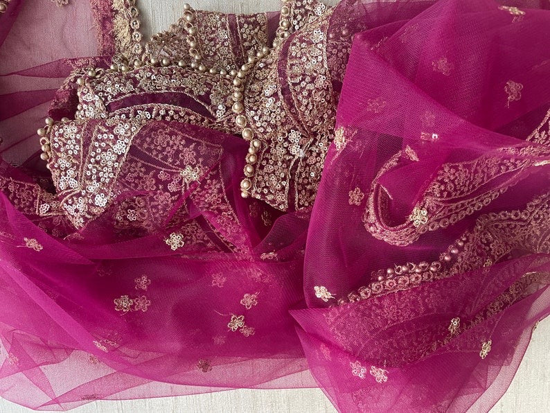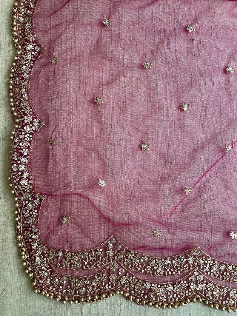 Length 2.5 meter approximate width 31-32 inches approximately. The broad border along the length and slimmer border at the ends. Golden beads on all four sides. Booti flowers all over the dupatta.