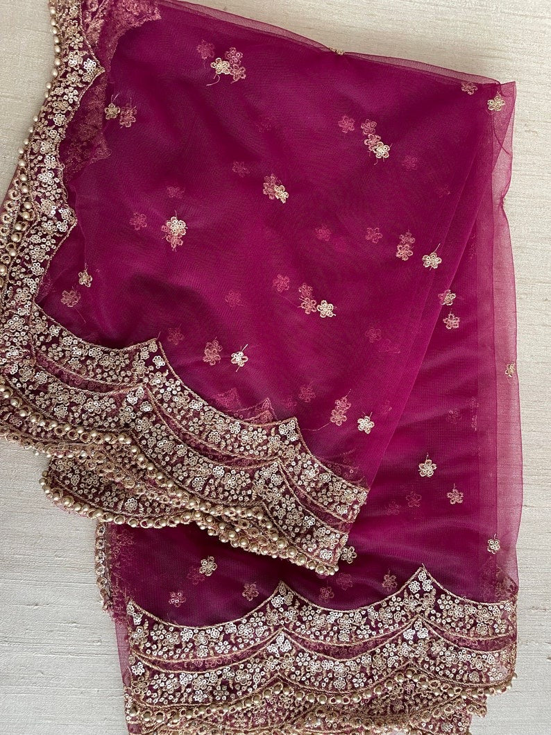 Net Dupattas - Double scalloped borders on two long side edges and the other two ends finished with the slim version of the same border. Golden beads on all four sides