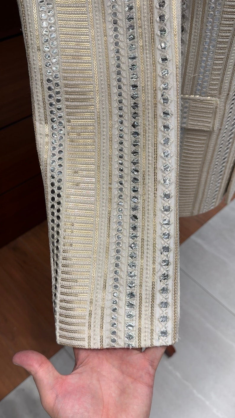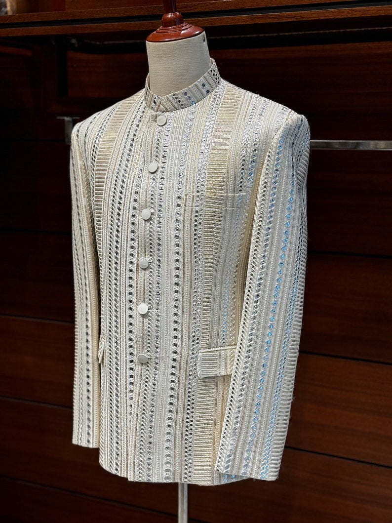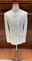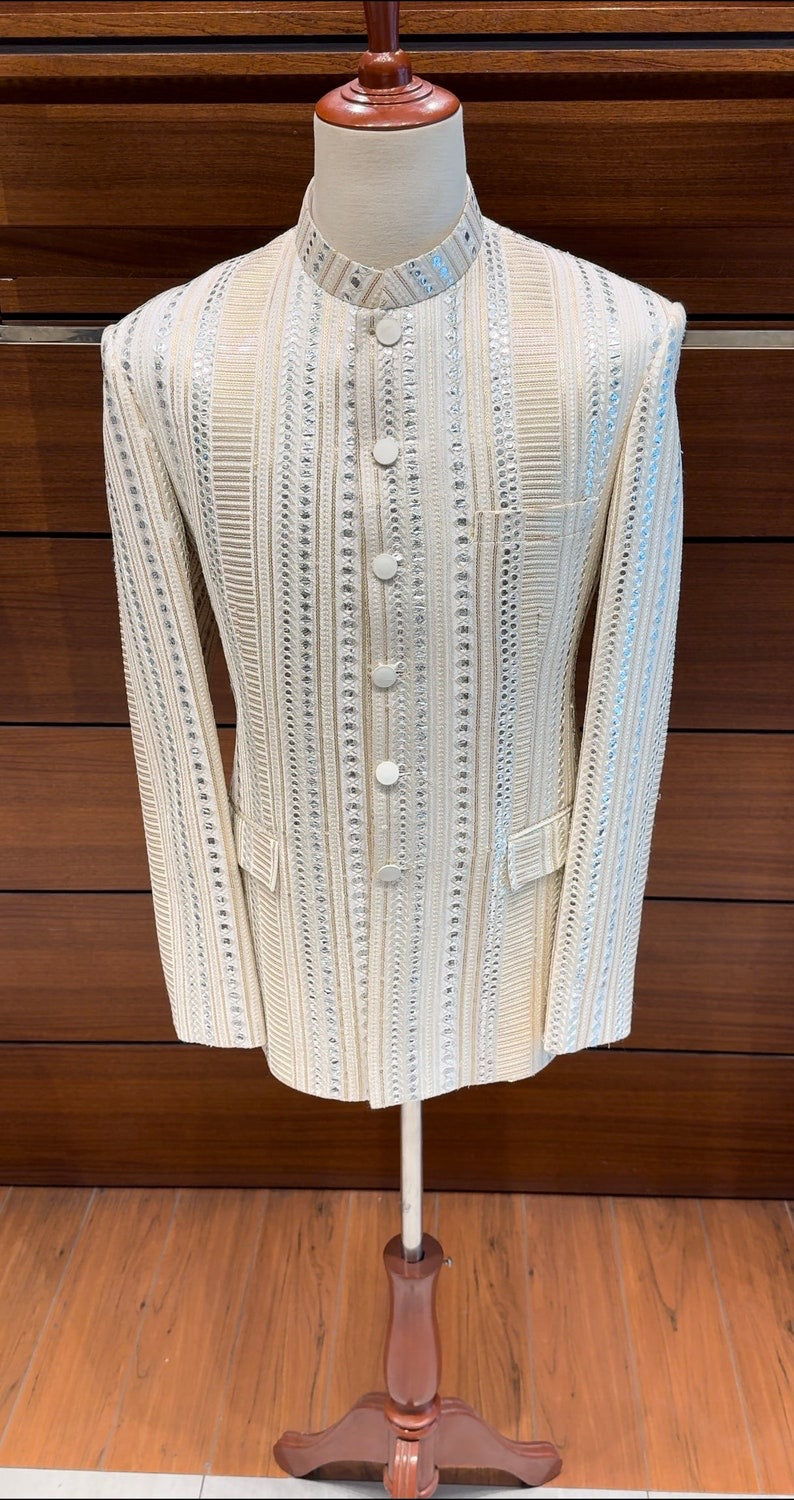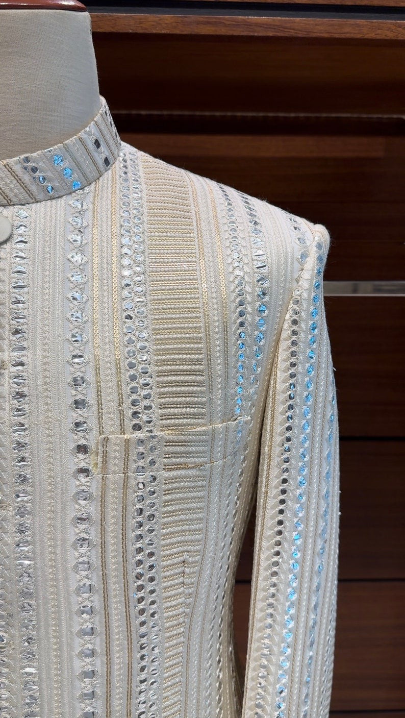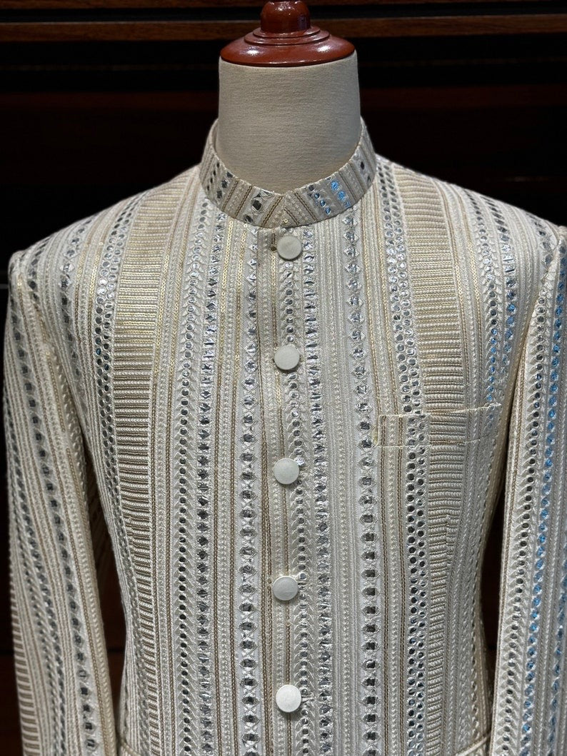 With our Cream White Prince Coat, designed for the discriminating groom, live in luxury. This exquisite piece of art, which combines opulence and elegance, is made from the finest silk and has a striking pattern and intricate sequin embroidery. Because the fabric is so expensive and rare, your special day will have a luxurious touch.