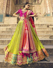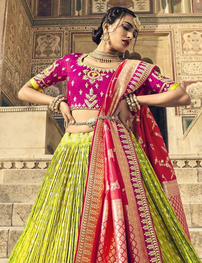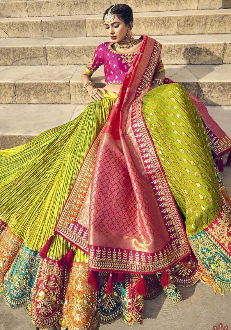 Crushed Silk Beautiful Green Lahenga Skirt with Pink Embellished Gotta Blouse